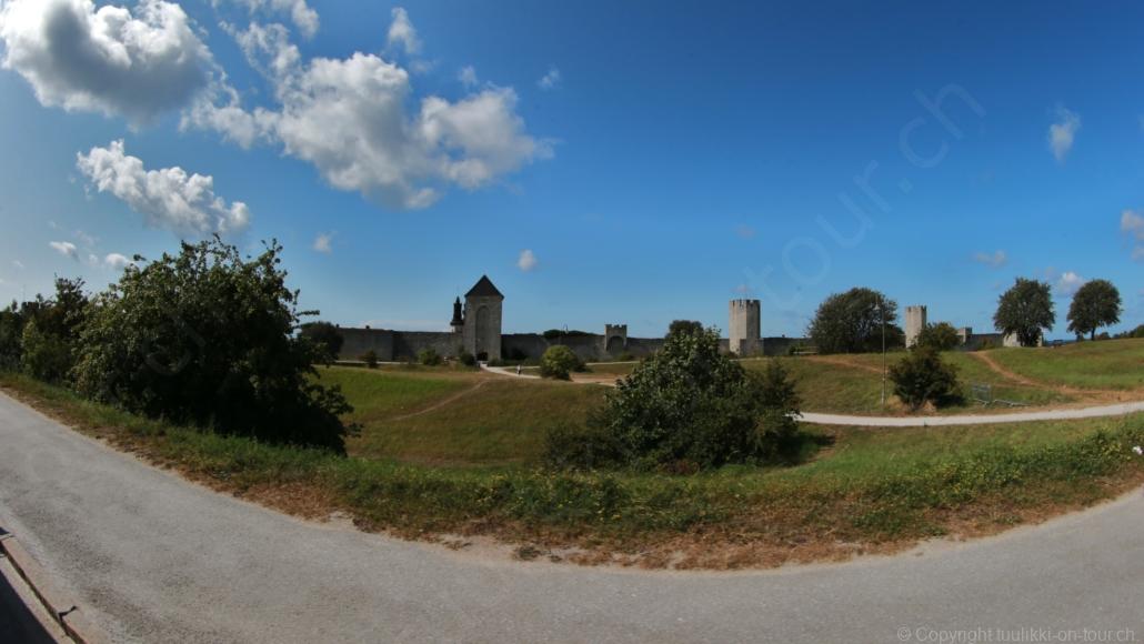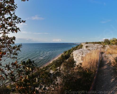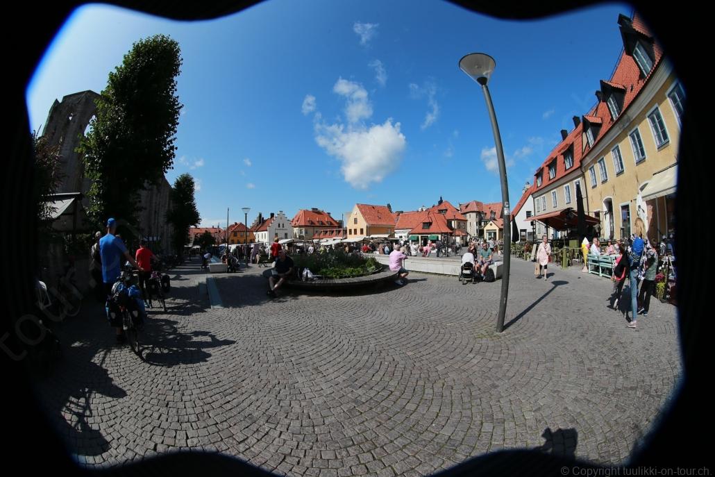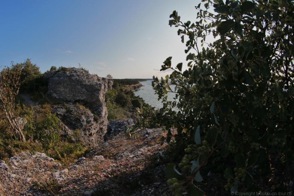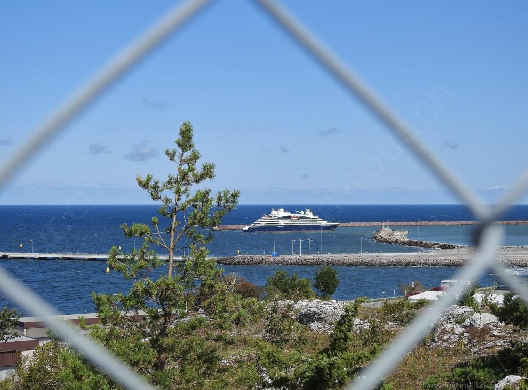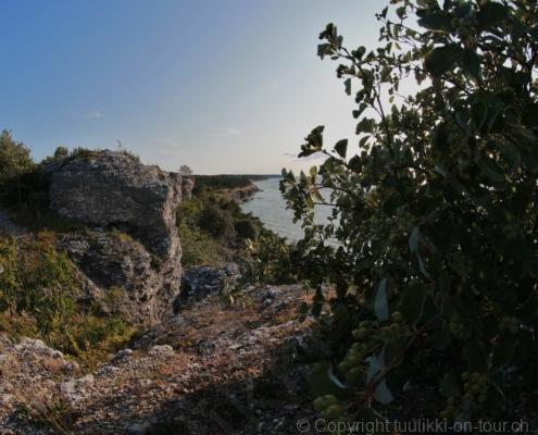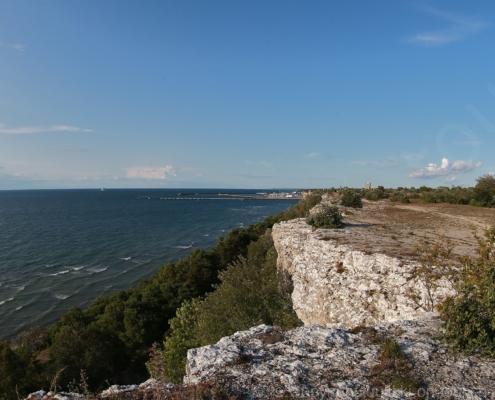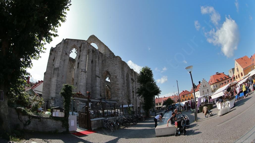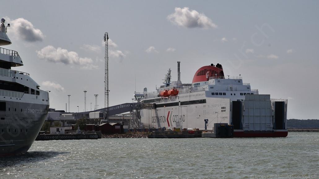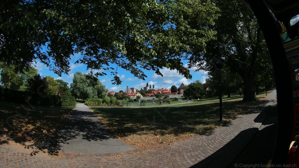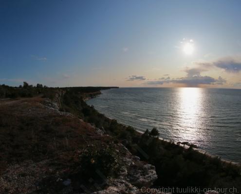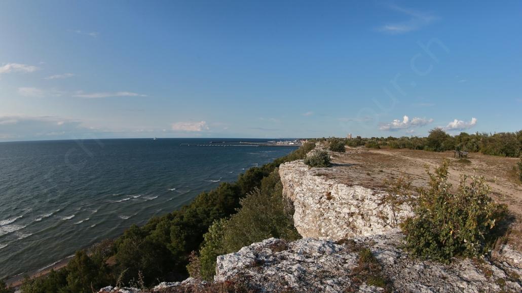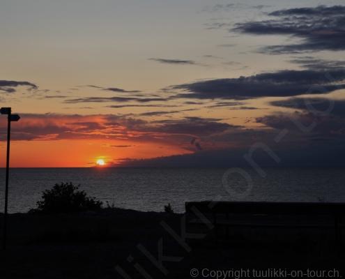 Am nächsten Morgen fahren wir zurück nach Visby. Es liegt ein grosses Kreuzfahrtschiff vor Anker und wir können mitverfolgen, wie – nebst der Fähre – noch ein weiteres einfährt. In Tourist Information holen wir Unterlagen und Informationen, um uns die Stadt noch etwas genauer anzuschauen. Es ist nicht mehr high-season und darum findet die Stadtführung nur noch täglich ein Mal um 11 Uhr statt … und jetzt sind sie schon ohne uns los. Dafür gibt es einen guten Stadtplan und Tipps wo wir durchspazieren und was wir unbedingt anschauen sollen. Zuerst aber fahren wir zum „Meeting Point“ beim Hafen, wo angrenzend ein Naturpark zum Spazieren einlädt. Verschiedene Wege führen der Küste entlang, was hier heisst, wir sind auf rund 40 m hohen Felsabhängen mit toller Aussicht auf die Ostsee und die ankommenden Schiffe. Über dem Parkplatz weht die Flagge Gotlands, ein stehender Widder mit goldener Kreuzstange auf blauem Grund. Zurück in die Stadt und eingestiegen in die „Bähnli-Tour“, welche mit Erklärungen ab Tonband rund um die Stadtmauer fährt. Danach geht es zu Fuss weiter zu den Ruinen, Fachwerkhäusern und in die Shopping-Gegend sowie in den Telia Shop (auch dort konnte man mir wegen dem nicht mehr funktionierenden WhatsApp nicht helfen!). Eindrücklich sind die Ruinen der St.Karin Kirche, neben der täglich ein Markt mit allerlei Ständen stattfindet. Dort wo der frühere, versandete Hafen war grünt jetzt ein Park mit speziellen Blumenrabatten. Es hat bestimmt für jeden Tag im Jahr ein Café oder Restaurant hier und alle sind kurz nach der Mittagszeit gut besetzt. Viele Touristen sind in der Stadt, die meisten wohl von den beiden riesigen Kreuzfahrtschiffen, die vor Anker liegen. Betonwidder als Strassensperren sind beliebt, es gibt sie im Souvenirshop auch klein und leicht. Besonders beliebt sind auch die Produkte aus der gekringelten Schafwolle des Gotlandschafs, dessen Wolle silbergrau bis dunkelbraun ist. Der Stadtrundgang über die Kopfsteinpflaster und an vielen Leuten vorbei macht müde. Wir fahren daher nur kurz aus der Stadt raus, um weiter südlich im Södra Hällarna Naturpark Stellung zu beziehen, die vielen Kaninchen zu beobachten und unsere Hunde im Zaum zu halten, die diesen unbedingt nachschnüffeln wollen. Seit langem können wir wieder einen schönen orangen Sonnenuntergang über der Ostsee mitverfolgen.