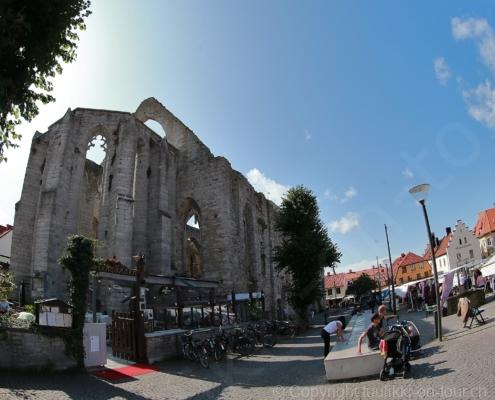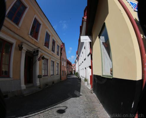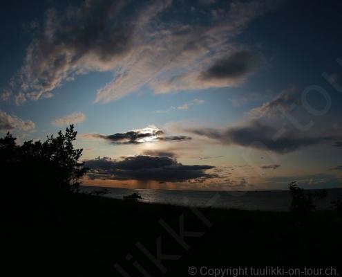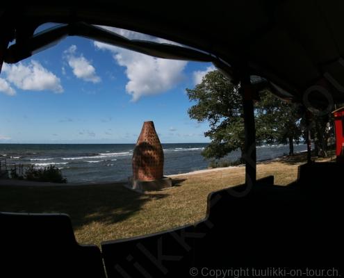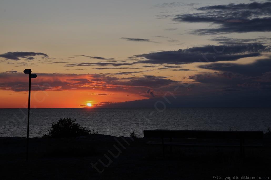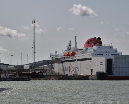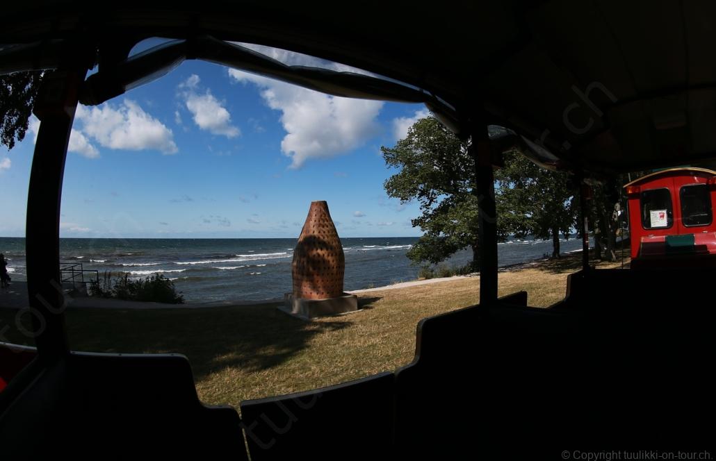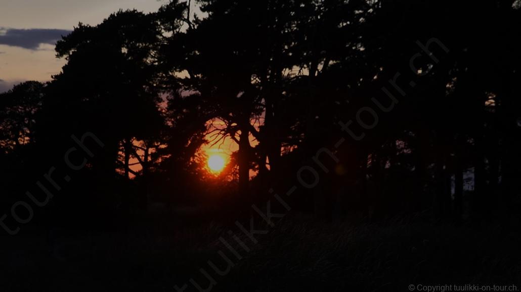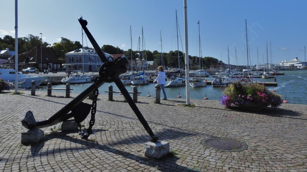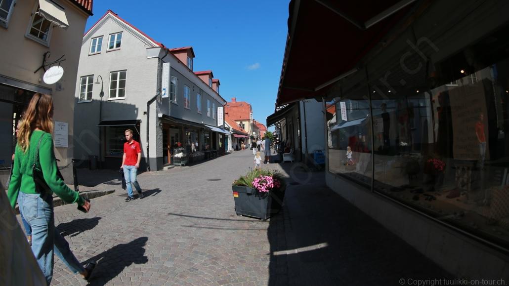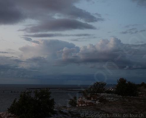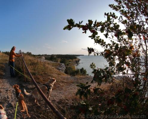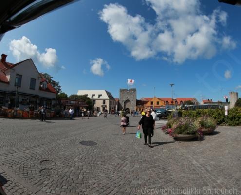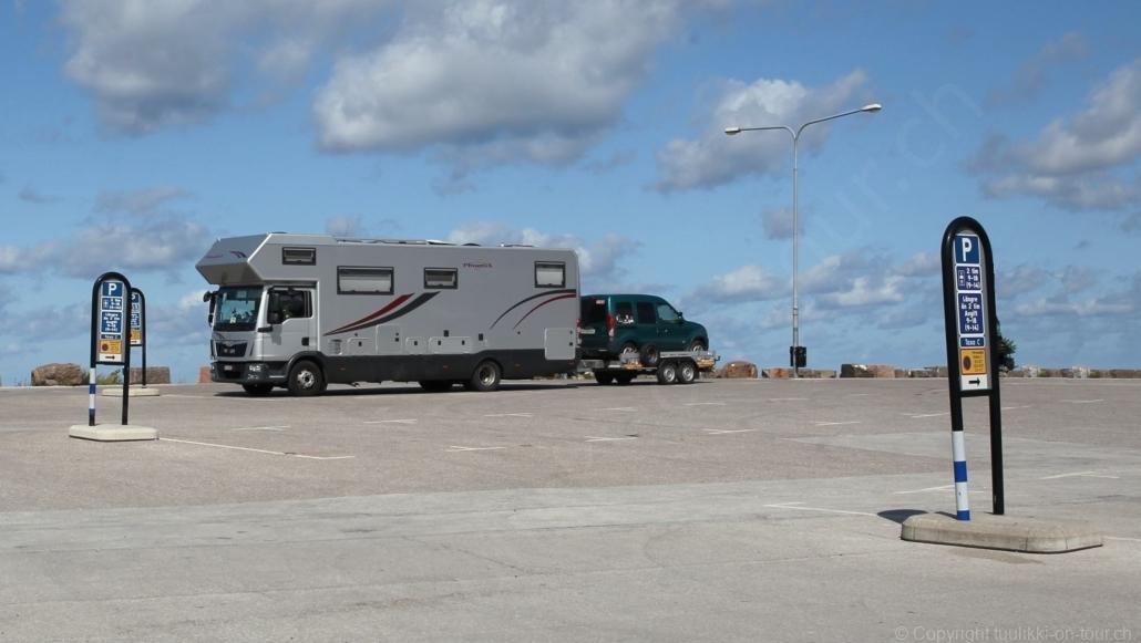 Am nächsten Morgen fahren wir zurück nach Visby. Es liegt ein grosses Kreuzfahrtschiff vor Anker und wir können mitverfolgen, wie – nebst der Fähre – noch ein weiteres einfährt. In Tourist Information holen wir Unterlagen und Informationen, um uns die Stadt noch etwas genauer anzuschauen. Es ist nicht mehr high-season und darum findet die Stadtführung nur noch täglich ein Mal um 11 Uhr statt … und jetzt sind sie schon ohne uns los. Dafür gibt es einen guten Stadtplan und Tipps wo wir durchspazieren und was wir unbedingt anschauen sollen. Zuerst aber fahren wir zum „Meeting Point“ beim Hafen, wo angrenzend ein Naturpark zum Spazieren einlädt. Verschiedene Wege führen der Küste entlang, was hier heisst, wir sind auf rund 40 m hohen Felsabhängen mit toller Aussicht auf die Ostsee und die ankommenden Schiffe. Über dem Parkplatz weht die Flagge Gotlands, ein stehender Widder mit goldener Kreuzstange auf blauem Grund. Zurück in die Stadt und eingestiegen in die „Bähnli-Tour“, welche mit Erklärungen ab Tonband rund um die Stadtmauer fährt. Danach geht es zu Fuss weiter zu den Ruinen, Fachwerkhäusern und in die Shopping-Gegend sowie in den Telia Shop (auch dort konnte man mir wegen dem nicht mehr funktionierenden WhatsApp nicht helfen!). Eindrücklich sind die Ruinen der St.Karin Kirche, neben der täglich ein Markt mit allerlei Ständen stattfindet. Dort wo der frühere, versandete Hafen war grünt jetzt ein Park mit speziellen Blumenrabatten. Es hat bestimmt für jeden Tag im Jahr ein Café oder Restaurant hier und alle sind kurz nach der Mittagszeit gut besetzt. Viele Touristen sind in der Stadt, die meisten wohl von den beiden riesigen Kreuzfahrtschiffen, die vor Anker liegen. Betonwidder als Strassensperren sind beliebt, es gibt sie im Souvenirshop auch klein und leicht. Besonders beliebt sind auch die Produkte aus der gekringelten Schafwolle des Gotlandschafs, dessen Wolle silbergrau bis dunkelbraun ist. Der Stadtrundgang über die Kopfsteinpflaster und an vielen Leuten vorbei macht müde. Wir fahren daher nur kurz aus der Stadt raus, um weiter südlich im Södra Hällarna Naturpark Stellung zu beziehen, die vielen Kaninchen zu beobachten und unsere Hunde im Zaum zu halten, die diesen unbedingt nachschnüffeln wollen. Seit langem können wir wieder einen schönen orangen Sonnenuntergang über der Ostsee mitverfolgen.