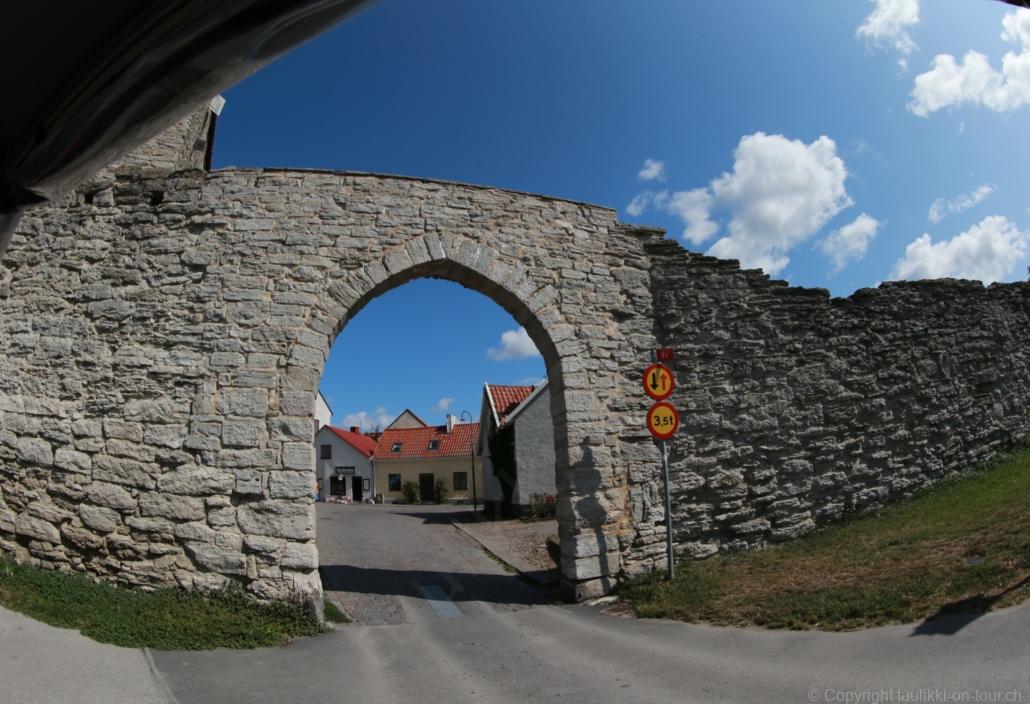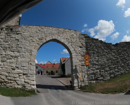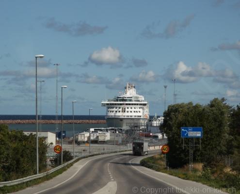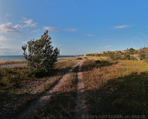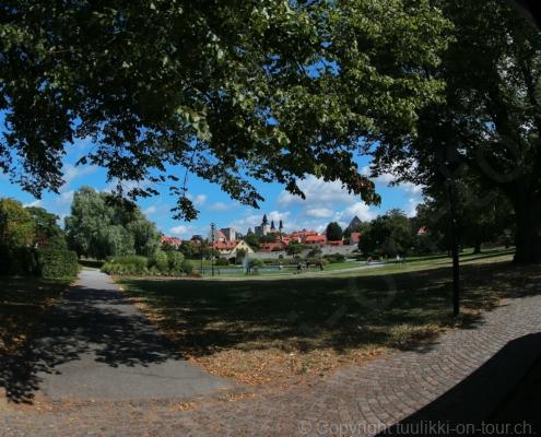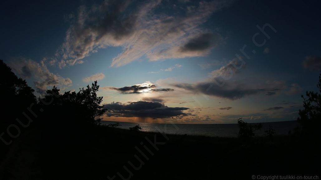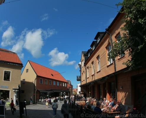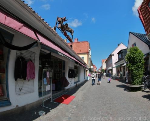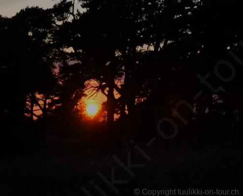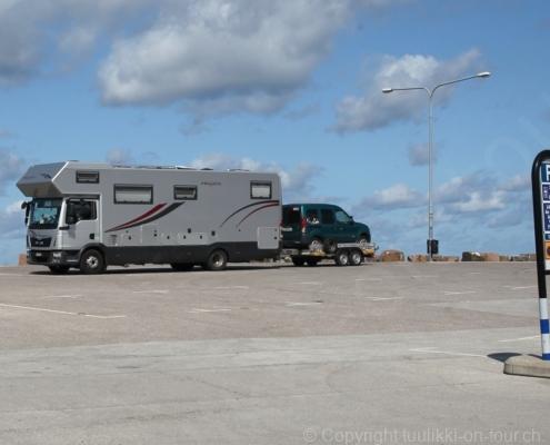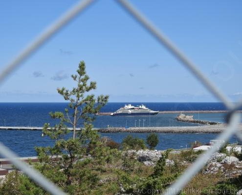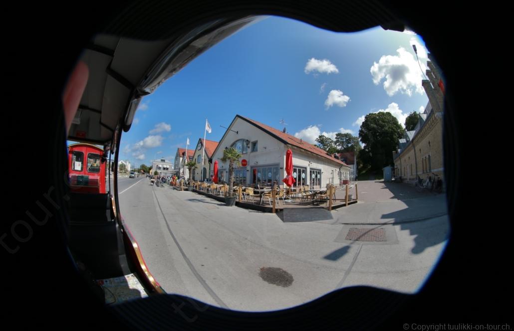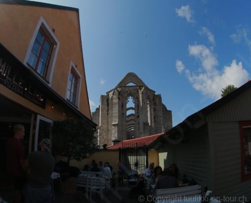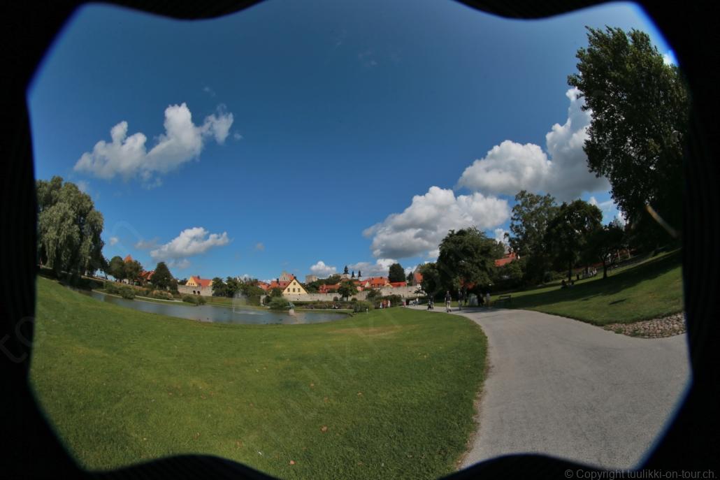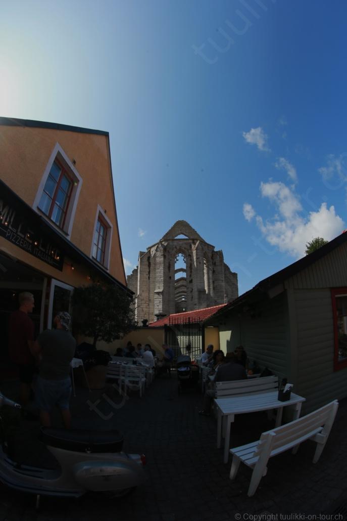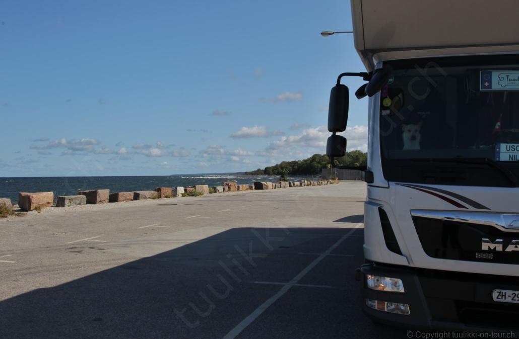 Am nächsten Morgen fahren wir zurück nach Visby. Es liegt ein grosses Kreuzfahrtschiff vor Anker und wir können mitverfolgen, wie – nebst der Fähre – noch ein weiteres einfährt. In Tourist Information holen wir Unterlagen und Informationen, um uns die Stadt noch etwas genauer anzuschauen. Es ist nicht mehr high-season und darum findet die Stadtführung nur noch täglich ein Mal um 11 Uhr statt … und jetzt sind sie schon ohne uns los. Dafür gibt es einen guten Stadtplan und Tipps wo wir durchspazieren und was wir unbedingt anschauen sollen. Zuerst aber fahren wir zum „Meeting Point“ beim Hafen, wo angrenzend ein Naturpark zum Spazieren einlädt. Verschiedene Wege führen der Küste entlang, was hier heisst, wir sind auf rund 40 m hohen Felsabhängen mit toller Aussicht auf die Ostsee und die ankommenden Schiffe. Über dem Parkplatz weht die Flagge Gotlands, ein stehender Widder mit goldener Kreuzstange auf blauem Grund. Zurück in die Stadt und eingestiegen in die „Bähnli-Tour“, welche mit Erklärungen ab Tonband rund um die Stadtmauer fährt. Danach geht es zu Fuss weiter zu den Ruinen, Fachwerkhäusern und in die Shopping-Gegend sowie in den Telia Shop (auch dort konnte man mir wegen dem nicht mehr funktionierenden WhatsApp nicht helfen!). Eindrücklich sind die Ruinen der St.Karin Kirche, neben der täglich ein Markt mit allerlei Ständen stattfindet. Dort wo der frühere, versandete Hafen war grünt jetzt ein Park mit speziellen Blumenrabatten. Es hat bestimmt für jeden Tag im Jahr ein Café oder Restaurant hier und alle sind kurz nach der Mittagszeit gut besetzt. Viele Touristen sind in der Stadt, die meisten wohl von den beiden riesigen Kreuzfahrtschiffen, die vor Anker liegen. Betonwidder als Strassensperren sind beliebt, es gibt sie im Souvenirshop auch klein und leicht. Besonders beliebt sind auch die Produkte aus der gekringelten Schafwolle des Gotlandschafs, dessen Wolle silbergrau bis dunkelbraun ist. Der Stadtrundgang über die Kopfsteinpflaster und an vielen Leuten vorbei macht müde. Wir fahren daher nur kurz aus der Stadt raus, um weiter südlich im Södra Hällarna Naturpark Stellung zu beziehen, die vielen Kaninchen zu beobachten und unsere Hunde im Zaum zu halten, die diesen unbedingt nachschnüffeln wollen. Seit langem können wir wieder einen schönen orangen Sonnenuntergang über der Ostsee mitverfolgen.