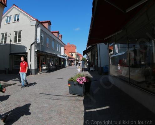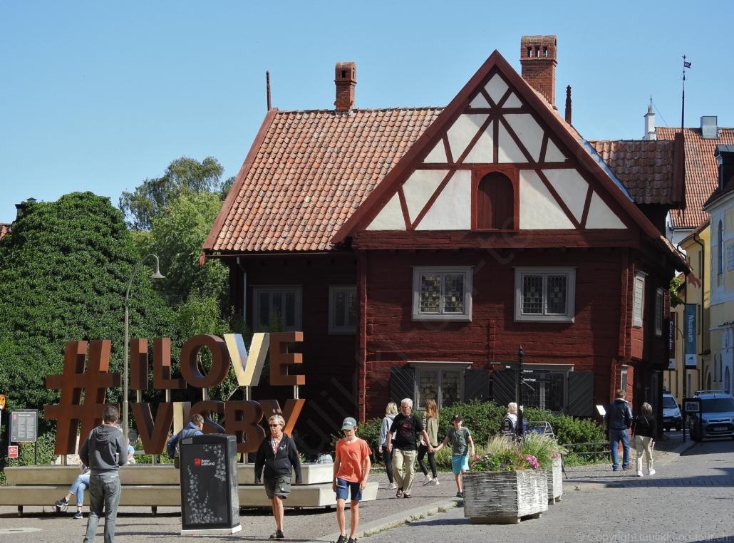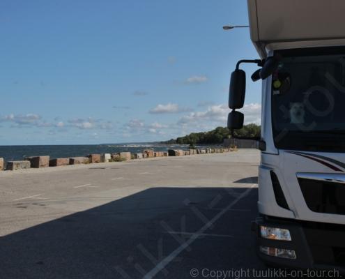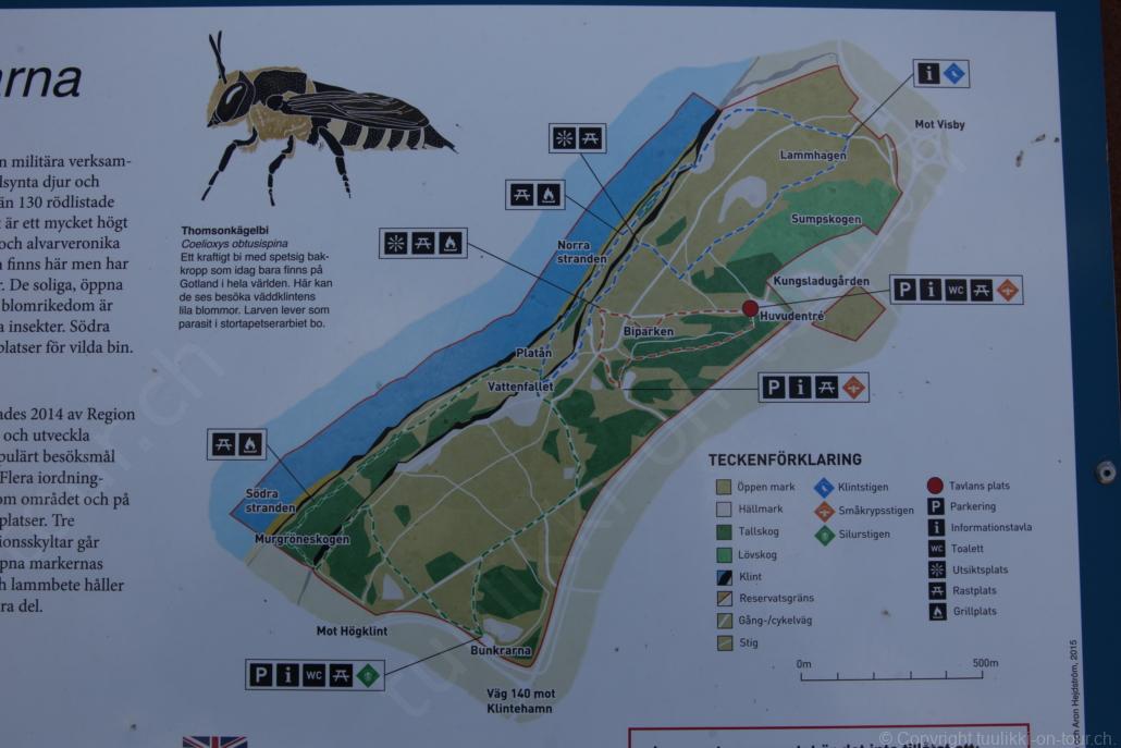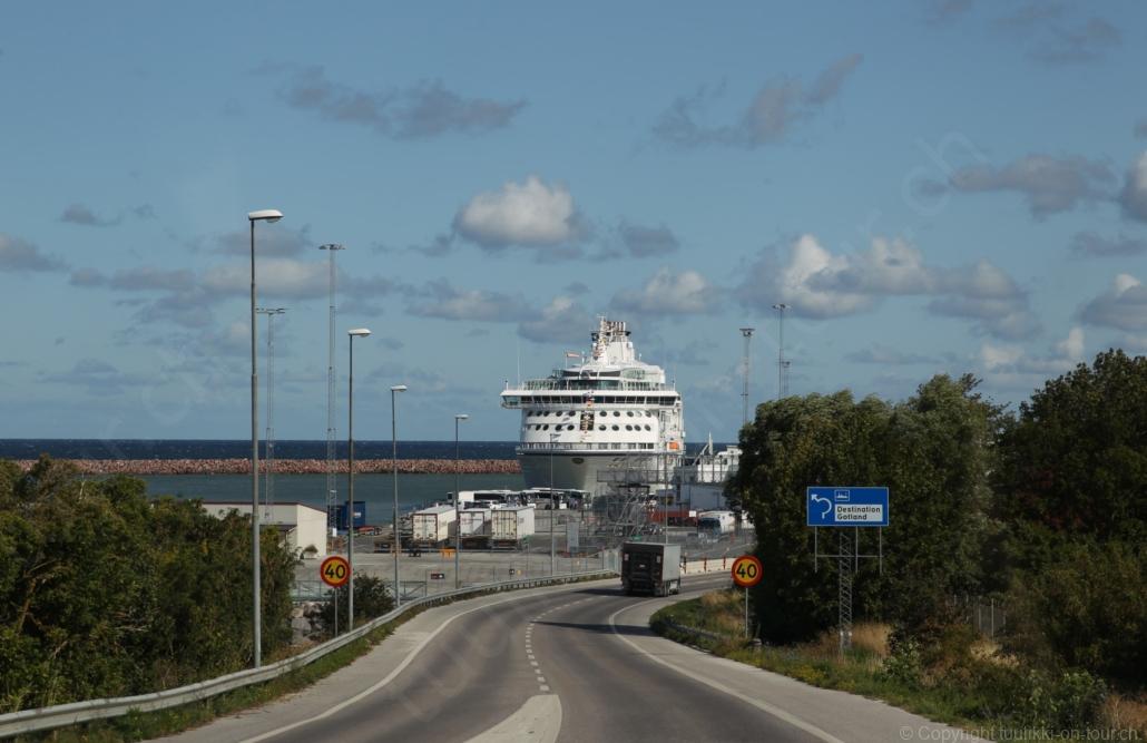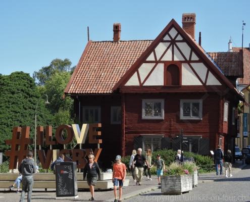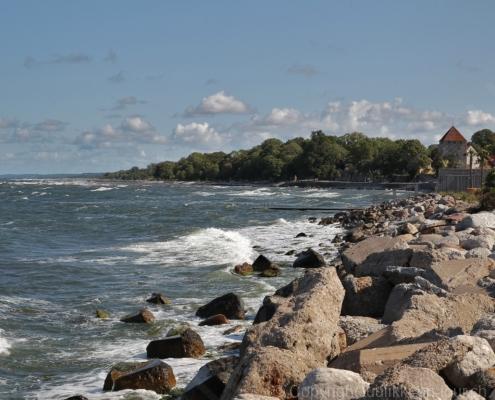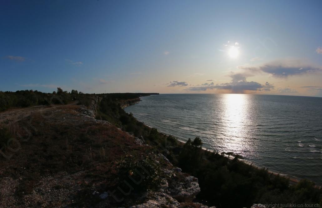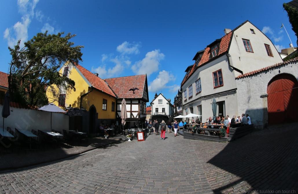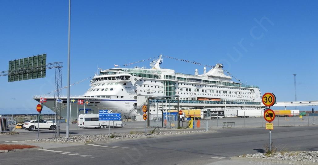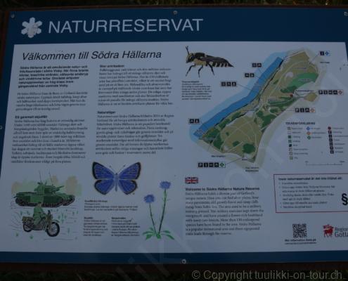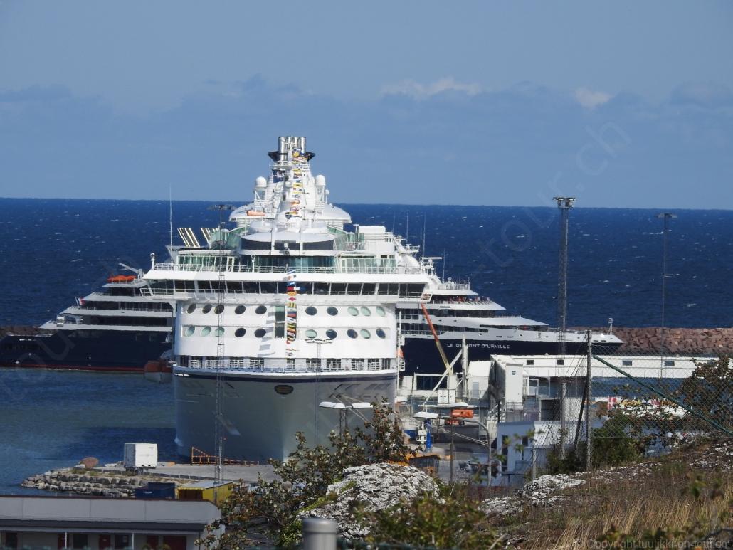 Am nächsten Morgen fahren wir zurück nach Visby. Es liegt ein grosses Kreuzfahrtschiff vor Anker und wir können mitverfolgen, wie – nebst der Fähre – noch ein weiteres einfährt. In Tourist Information holen wir Unterlagen und Informationen, um uns die Stadt noch etwas genauer anzuschauen. Es ist nicht mehr high-season und darum findet die Stadtführung nur noch täglich ein Mal um 11 Uhr statt … und jetzt sind sie schon ohne uns los. Dafür gibt es einen guten Stadtplan und Tipps wo wir durchspazieren und was wir unbedingt anschauen sollen. Zuerst aber fahren wir zum „Meeting Point“ beim Hafen, wo angrenzend ein Naturpark zum Spazieren einlädt. Verschiedene Wege führen der Küste entlang, was hier heisst, wir sind auf rund 40 m hohen Felsabhängen mit toller Aussicht auf die Ostsee und die ankommenden Schiffe. Über dem Parkplatz weht die Flagge Gotlands, ein stehender Widder mit goldener Kreuzstange auf blauem Grund. Zurück in die Stadt und eingestiegen in die „Bähnli-Tour“, welche mit Erklärungen ab Tonband rund um die Stadtmauer fährt. Danach geht es zu Fuss weiter zu den Ruinen, Fachwerkhäusern und in die Shopping-Gegend sowie in den Telia Shop (auch dort konnte man mir wegen dem nicht mehr funktionierenden WhatsApp nicht helfen!). Eindrücklich sind die Ruinen der St.Karin Kirche, neben der täglich ein Markt mit allerlei Ständen stattfindet. Dort wo der frühere, versandete Hafen war grünt jetzt ein Park mit speziellen Blumenrabatten. Es hat bestimmt für jeden Tag im Jahr ein Café oder Restaurant hier und alle sind kurz nach der Mittagszeit gut besetzt. Viele Touristen sind in der Stadt, die meisten wohl von den beiden riesigen Kreuzfahrtschiffen, die vor Anker liegen. Betonwidder als Strassensperren sind beliebt, es gibt sie im Souvenirshop auch klein und leicht. Besonders beliebt sind auch die Produkte aus der gekringelten Schafwolle des Gotlandschafs, dessen Wolle silbergrau bis dunkelbraun ist. Der Stadtrundgang über die Kopfsteinpflaster und an vielen Leuten vorbei macht müde. Wir fahren daher nur kurz aus der Stadt raus, um weiter südlich im Södra Hällarna Naturpark Stellung zu beziehen, die vielen Kaninchen zu beobachten und unsere Hunde im Zaum zu halten, die diesen unbedingt nachschnüffeln wollen. Seit langem können wir wieder einen schönen orangen Sonnenuntergang über der Ostsee mitverfolgen.