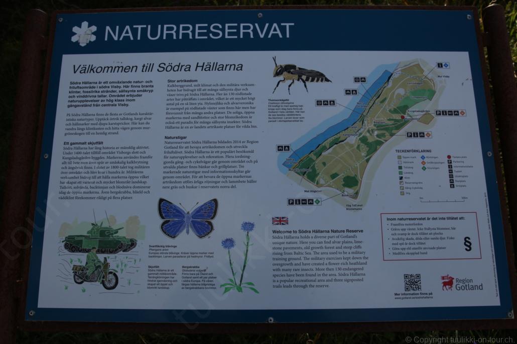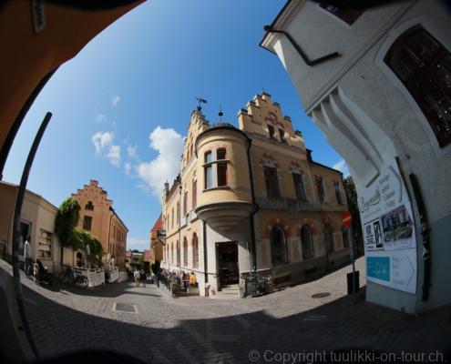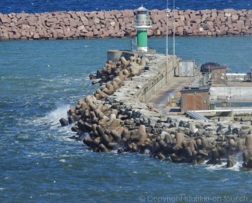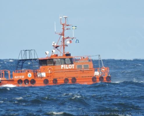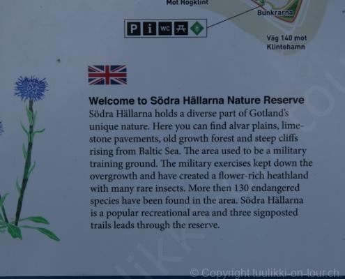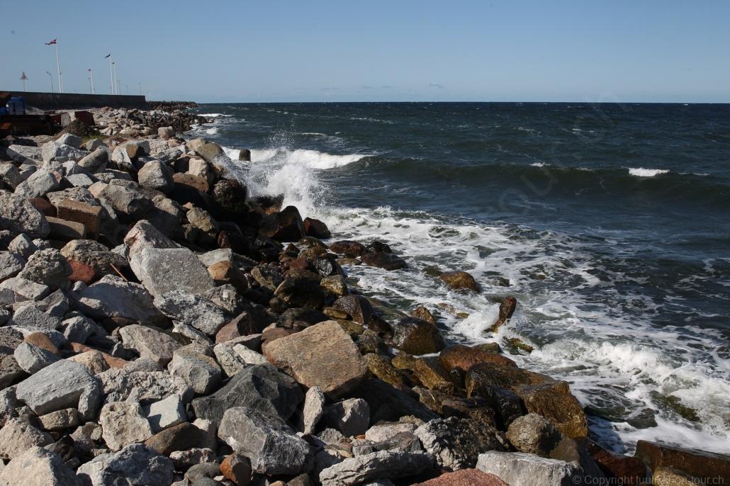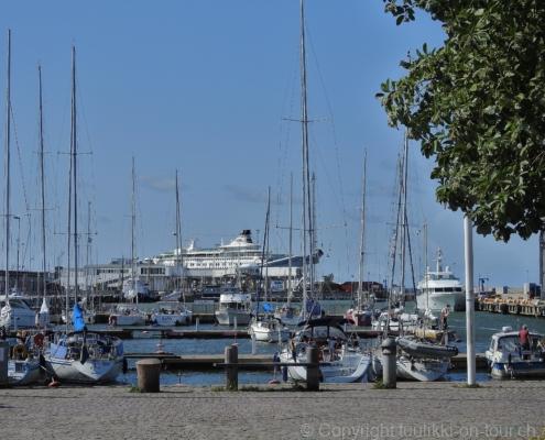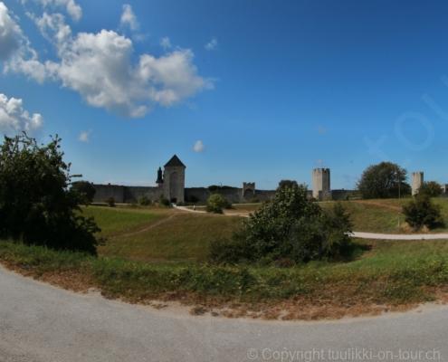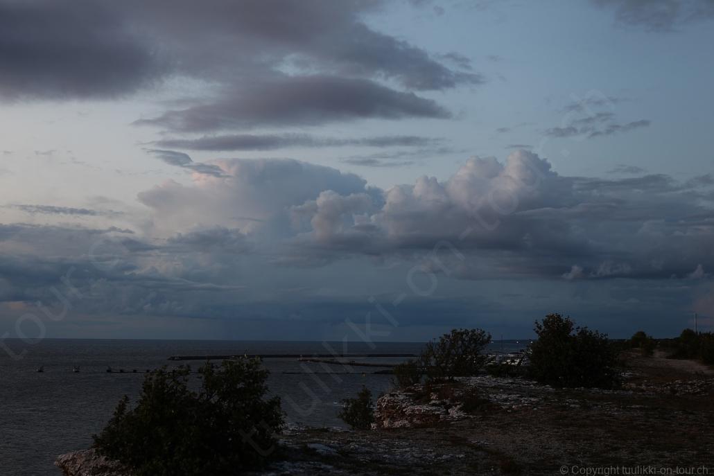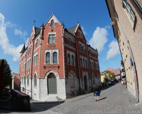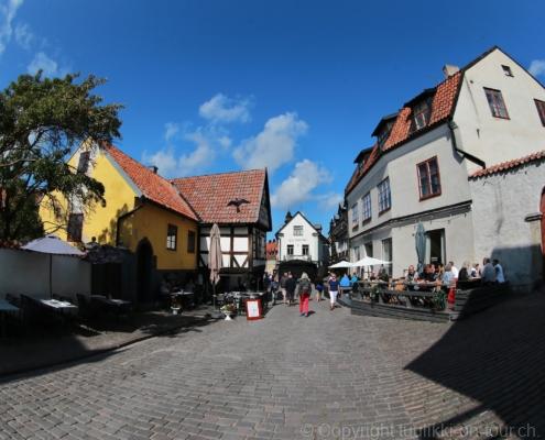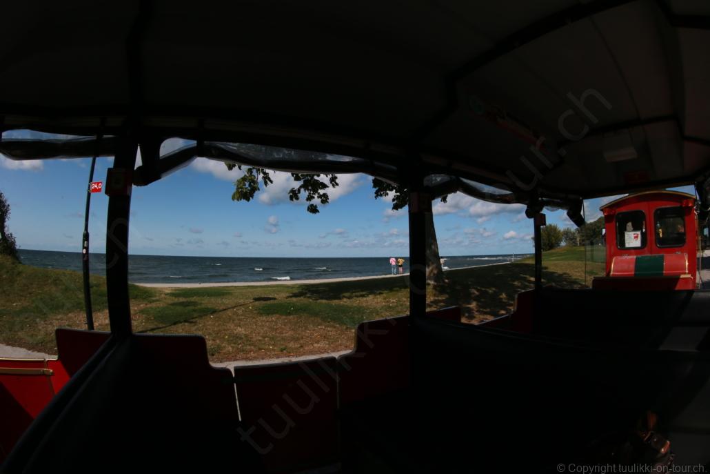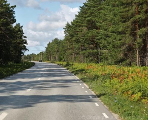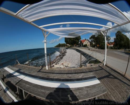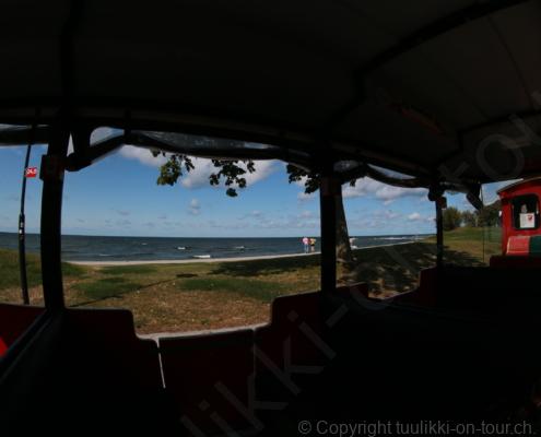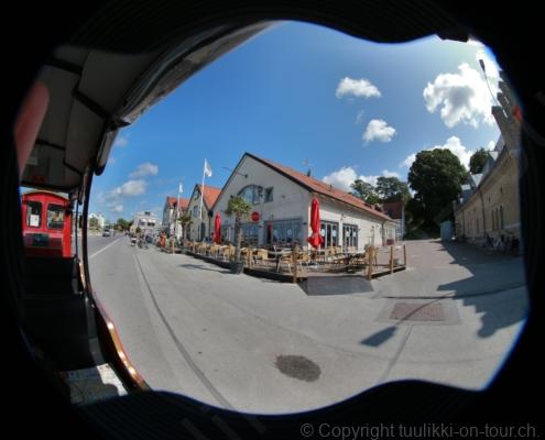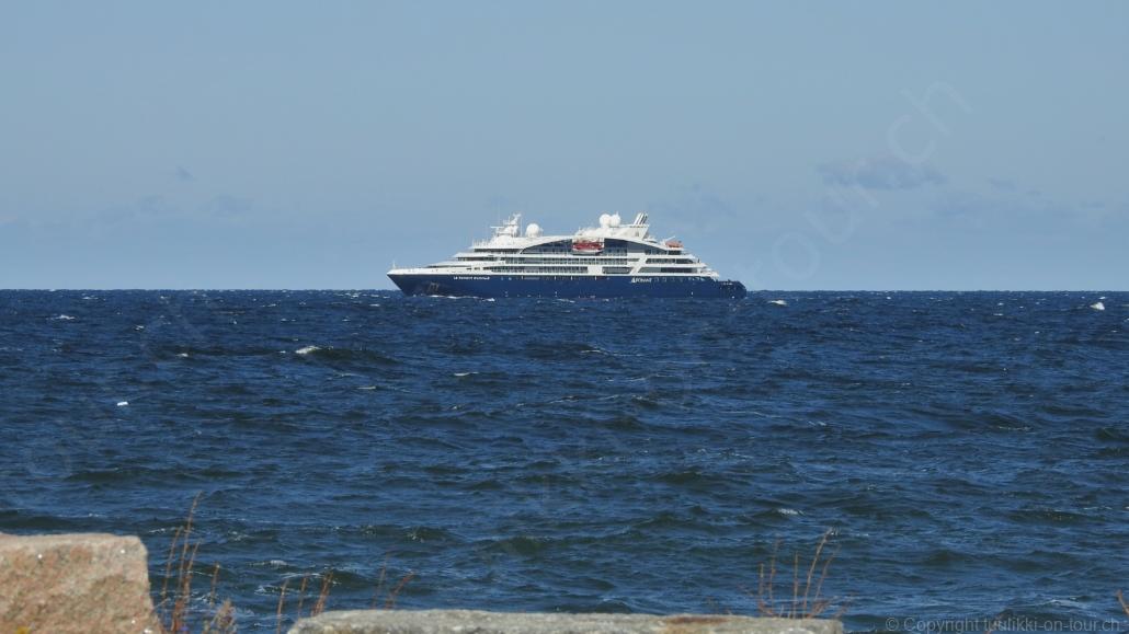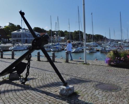 Am nächsten Morgen fahren wir zurück nach Visby. Es liegt ein grosses Kreuzfahrtschiff vor Anker und wir können mitverfolgen, wie – nebst der Fähre – noch ein weiteres einfährt. In Tourist Information holen wir Unterlagen und Informationen, um uns die Stadt noch etwas genauer anzuschauen. Es ist nicht mehr high-season und darum findet die Stadtführung nur noch täglich ein Mal um 11 Uhr statt … und jetzt sind sie schon ohne uns los. Dafür gibt es einen guten Stadtplan und Tipps wo wir durchspazieren und was wir unbedingt anschauen sollen. Zuerst aber fahren wir zum „Meeting Point“ beim Hafen, wo angrenzend ein Naturpark zum Spazieren einlädt. Verschiedene Wege führen der Küste entlang, was hier heisst, wir sind auf rund 40 m hohen Felsabhängen mit toller Aussicht auf die Ostsee und die ankommenden Schiffe. Über dem Parkplatz weht die Flagge Gotlands, ein stehender Widder mit goldener Kreuzstange auf blauem Grund. Zurück in die Stadt und eingestiegen in die „Bähnli-Tour“, welche mit Erklärungen ab Tonband rund um die Stadtmauer fährt. Danach geht es zu Fuss weiter zu den Ruinen, Fachwerkhäusern und in die Shopping-Gegend sowie in den Telia Shop (auch dort konnte man mir wegen dem nicht mehr funktionierenden WhatsApp nicht helfen!). Eindrücklich sind die Ruinen der St.Karin Kirche, neben der täglich ein Markt mit allerlei Ständen stattfindet. Dort wo der frühere, versandete Hafen war grünt jetzt ein Park mit speziellen Blumenrabatten. Es hat bestimmt für jeden Tag im Jahr ein Café oder Restaurant hier und alle sind kurz nach der Mittagszeit gut besetzt. Viele Touristen sind in der Stadt, die meisten wohl von den beiden riesigen Kreuzfahrtschiffen, die vor Anker liegen. Betonwidder als Strassensperren sind beliebt, es gibt sie im Souvenirshop auch klein und leicht. Besonders beliebt sind auch die Produkte aus der gekringelten Schafwolle des Gotlandschafs, dessen Wolle silbergrau bis dunkelbraun ist. Der Stadtrundgang über die Kopfsteinpflaster und an vielen Leuten vorbei macht müde. Wir fahren daher nur kurz aus der Stadt raus, um weiter südlich im Södra Hällarna Naturpark Stellung zu beziehen, die vielen Kaninchen zu beobachten und unsere Hunde im Zaum zu halten, die diesen unbedingt nachschnüffeln wollen. Seit langem können wir wieder einen schönen orangen Sonnenuntergang über der Ostsee mitverfolgen.