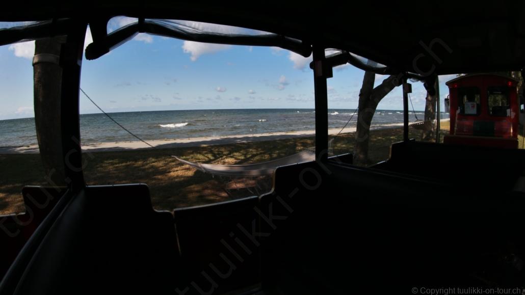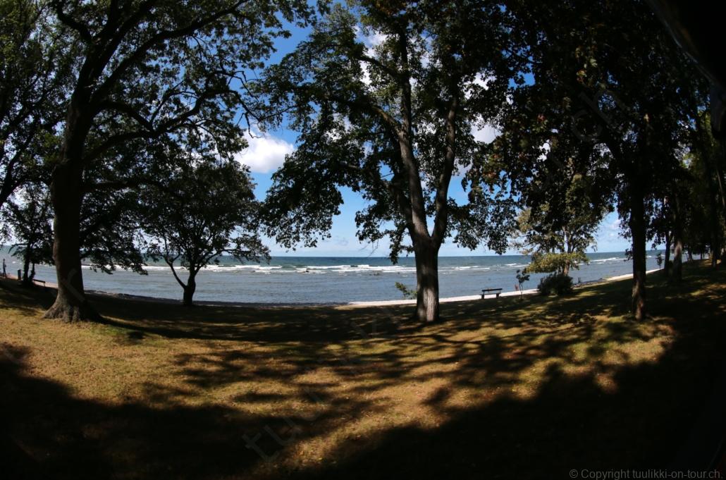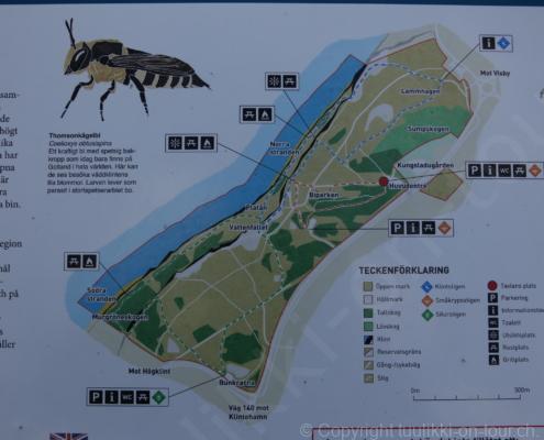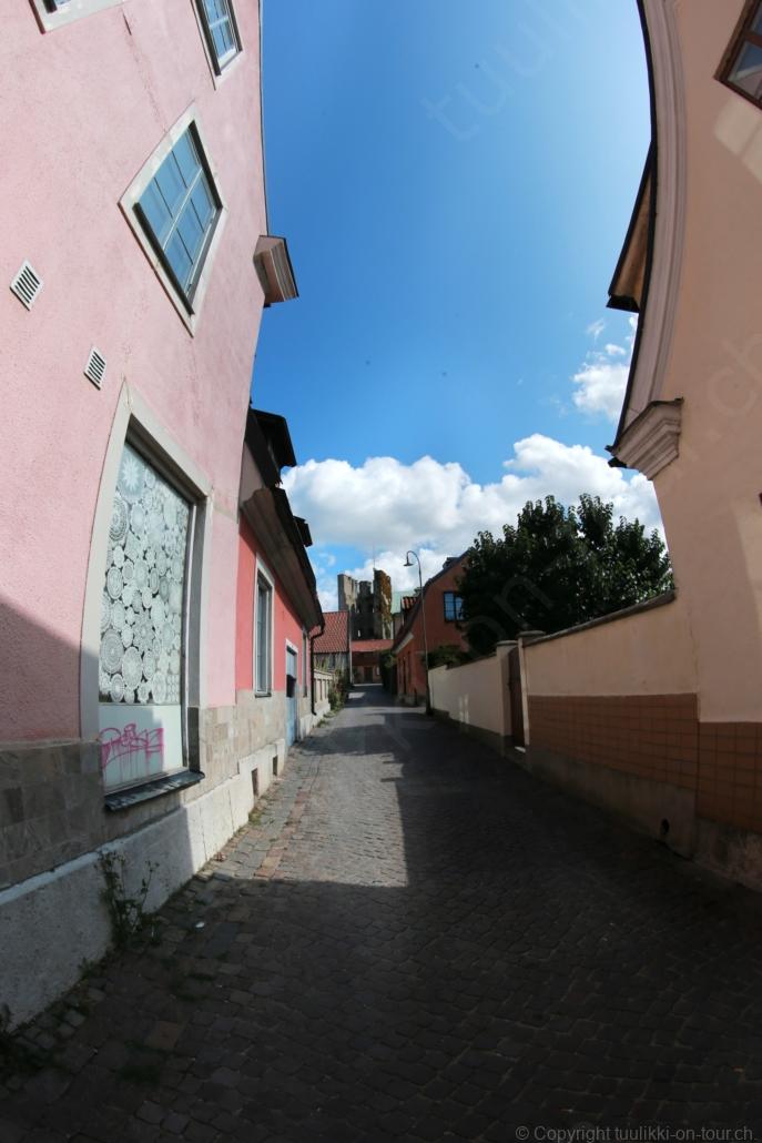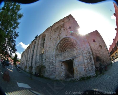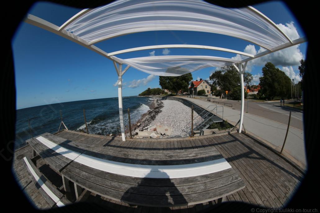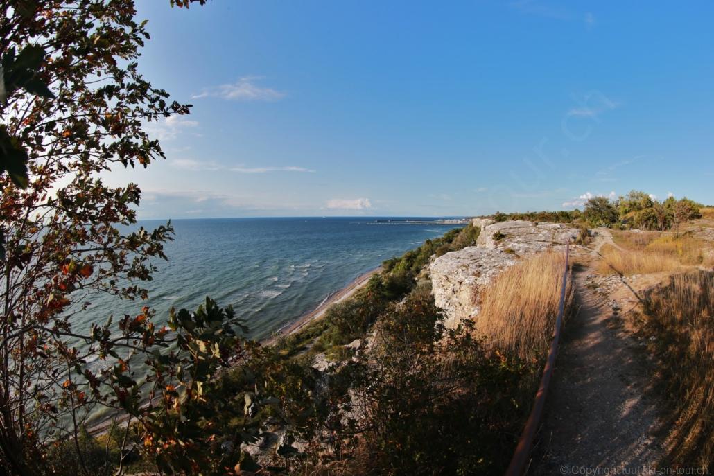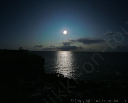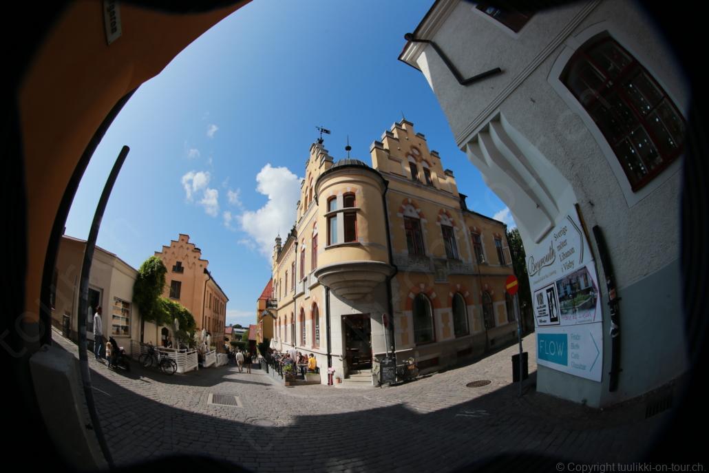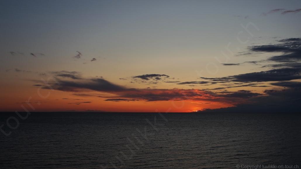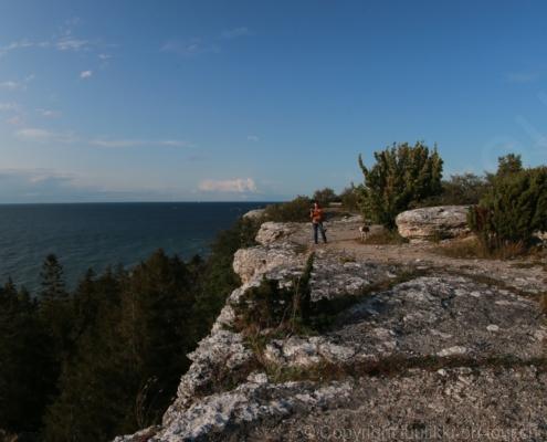 Am nächsten Morgen fahren wir zurück nach Visby. Es liegt ein grosses Kreuzfahrtschiff vor Anker und wir können mitverfolgen, wie – nebst der Fähre – noch ein weiteres einfährt. In Tourist Information holen wir Unterlagen und Informationen, um uns die Stadt noch etwas genauer anzuschauen. Es ist nicht mehr high-season und darum findet die Stadtführung nur noch täglich ein Mal um 11 Uhr statt … und jetzt sind sie schon ohne uns los. Dafür gibt es einen guten Stadtplan und Tipps wo wir durchspazieren und was wir unbedingt anschauen sollen. Zuerst aber fahren wir zum „Meeting Point“ beim Hafen, wo angrenzend ein Naturpark zum Spazieren einlädt. Verschiedene Wege führen der Küste entlang, was hier heisst, wir sind auf rund 40 m hohen Felsabhängen mit toller Aussicht auf die Ostsee und die ankommenden Schiffe. Über dem Parkplatz weht die Flagge Gotlands, ein stehender Widder mit goldener Kreuzstange auf blauem Grund. Zurück in die Stadt und eingestiegen in die „Bähnli-Tour“, welche mit Erklärungen ab Tonband rund um die Stadtmauer fährt. Danach geht es zu Fuss weiter zu den Ruinen, Fachwerkhäusern und in die Shopping-Gegend sowie in den Telia Shop (auch dort konnte man mir wegen dem nicht mehr funktionierenden WhatsApp nicht helfen!). Eindrücklich sind die Ruinen der St.Karin Kirche, neben der täglich ein Markt mit allerlei Ständen stattfindet. Dort wo der frühere, versandete Hafen war grünt jetzt ein Park mit speziellen Blumenrabatten. Es hat bestimmt für jeden Tag im Jahr ein Café oder Restaurant hier und alle sind kurz nach der Mittagszeit gut besetzt. Viele Touristen sind in der Stadt, die meisten wohl von den beiden riesigen Kreuzfahrtschiffen, die vor Anker liegen. Betonwidder als Strassensperren sind beliebt, es gibt sie im Souvenirshop auch klein und leicht. Besonders beliebt sind auch die Produkte aus der gekringelten Schafwolle des Gotlandschafs, dessen Wolle silbergrau bis dunkelbraun ist. Der Stadtrundgang über die Kopfsteinpflaster und an vielen Leuten vorbei macht müde. Wir fahren daher nur kurz aus der Stadt raus, um weiter südlich im Södra Hällarna Naturpark Stellung zu beziehen, die vielen Kaninchen zu beobachten und unsere Hunde im Zaum zu halten, die diesen unbedingt nachschnüffeln wollen. Seit langem können wir wieder einen schönen orangen Sonnenuntergang über der Ostsee mitverfolgen.