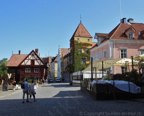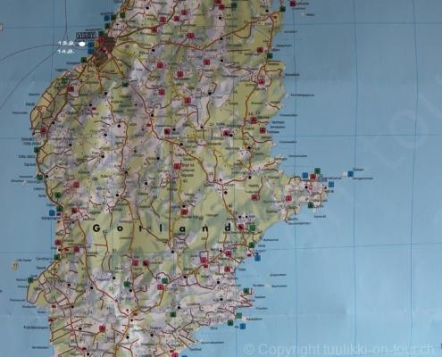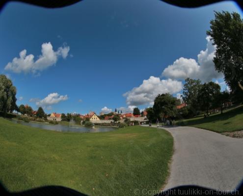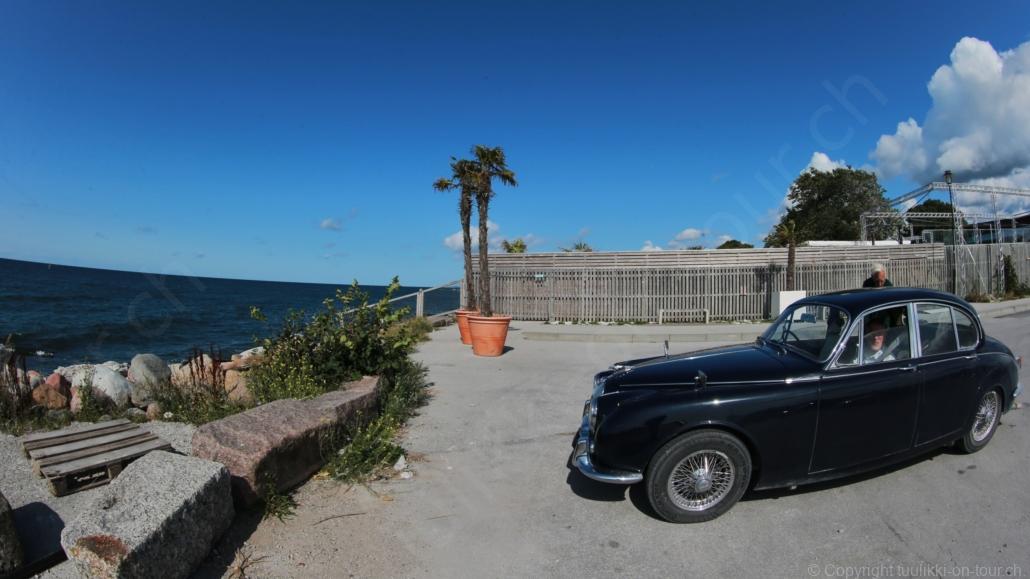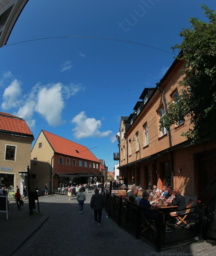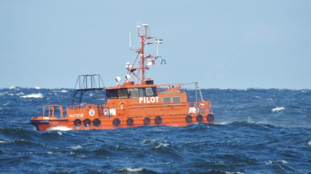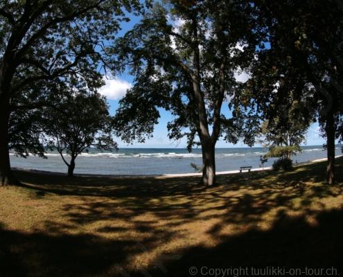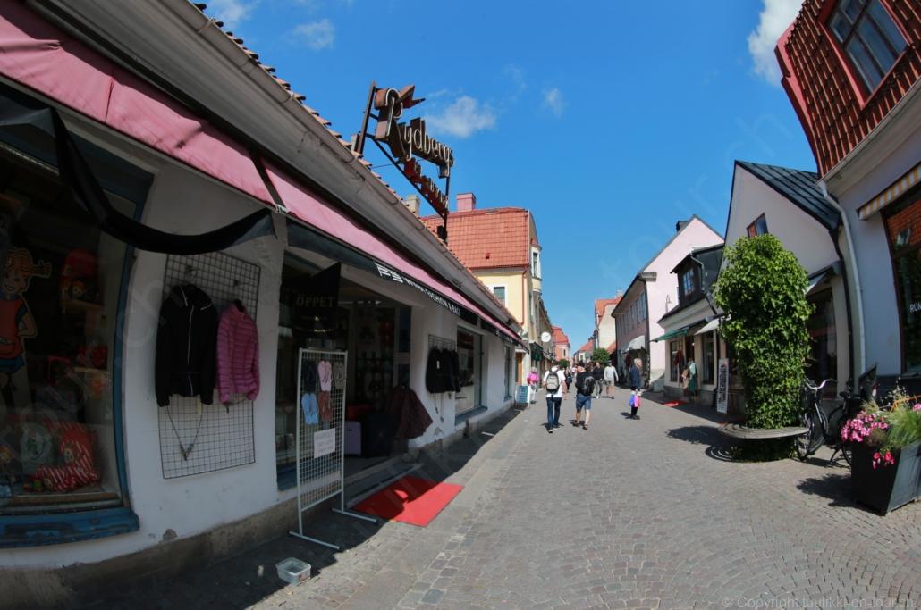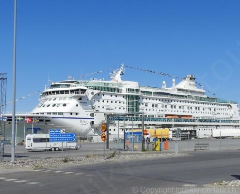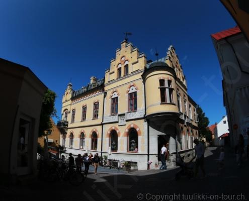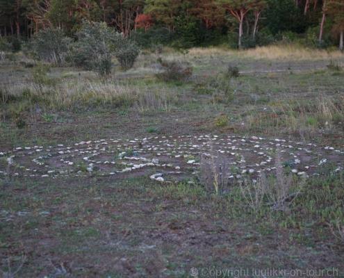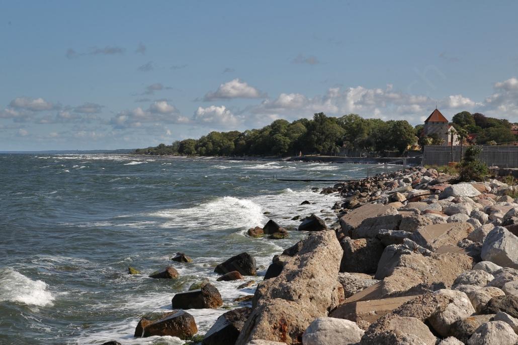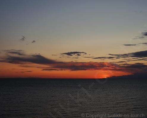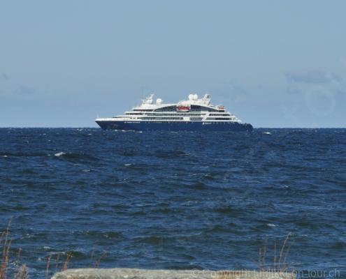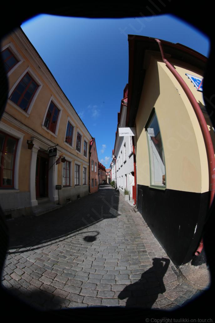 Am nächsten Morgen fahren wir zurück nach Visby. Es liegt ein grosses Kreuzfahrtschiff vor Anker und wir können mitverfolgen, wie – nebst der Fähre – noch ein weiteres einfährt. In Tourist Information holen wir Unterlagen und Informationen, um uns die Stadt noch etwas genauer anzuschauen. Es ist nicht mehr high-season und darum findet die Stadtführung nur noch täglich ein Mal um 11 Uhr statt … und jetzt sind sie schon ohne uns los. Dafür gibt es einen guten Stadtplan und Tipps wo wir durchspazieren und was wir unbedingt anschauen sollen. Zuerst aber fahren wir zum „Meeting Point“ beim Hafen, wo angrenzend ein Naturpark zum Spazieren einlädt. Verschiedene Wege führen der Küste entlang, was hier heisst, wir sind auf rund 40 m hohen Felsabhängen mit toller Aussicht auf die Ostsee und die ankommenden Schiffe. Über dem Parkplatz weht die Flagge Gotlands, ein stehender Widder mit goldener Kreuzstange auf blauem Grund. Zurück in die Stadt und eingestiegen in die „Bähnli-Tour“, welche mit Erklärungen ab Tonband rund um die Stadtmauer fährt. Danach geht es zu Fuss weiter zu den Ruinen, Fachwerkhäusern und in die Shopping-Gegend sowie in den Telia Shop (auch dort konnte man mir wegen dem nicht mehr funktionierenden WhatsApp nicht helfen!). Eindrücklich sind die Ruinen der St.Karin Kirche, neben der täglich ein Markt mit allerlei Ständen stattfindet. Dort wo der frühere, versandete Hafen war grünt jetzt ein Park mit speziellen Blumenrabatten. Es hat bestimmt für jeden Tag im Jahr ein Café oder Restaurant hier und alle sind kurz nach der Mittagszeit gut besetzt. Viele Touristen sind in der Stadt, die meisten wohl von den beiden riesigen Kreuzfahrtschiffen, die vor Anker liegen. Betonwidder als Strassensperren sind beliebt, es gibt sie im Souvenirshop auch klein und leicht. Besonders beliebt sind auch die Produkte aus der gekringelten Schafwolle des Gotlandschafs, dessen Wolle silbergrau bis dunkelbraun ist. Der Stadtrundgang über die Kopfsteinpflaster und an vielen Leuten vorbei macht müde. Wir fahren daher nur kurz aus der Stadt raus, um weiter südlich im Södra Hällarna Naturpark Stellung zu beziehen, die vielen Kaninchen zu beobachten und unsere Hunde im Zaum zu halten, die diesen unbedingt nachschnüffeln wollen. Seit langem können wir wieder einen schönen orangen Sonnenuntergang über der Ostsee mitverfolgen.