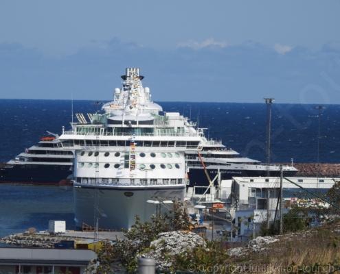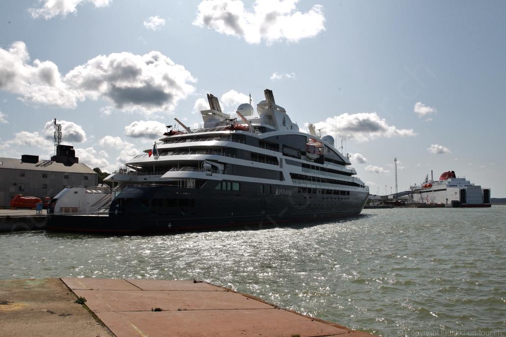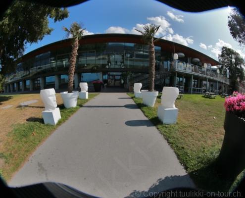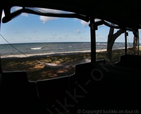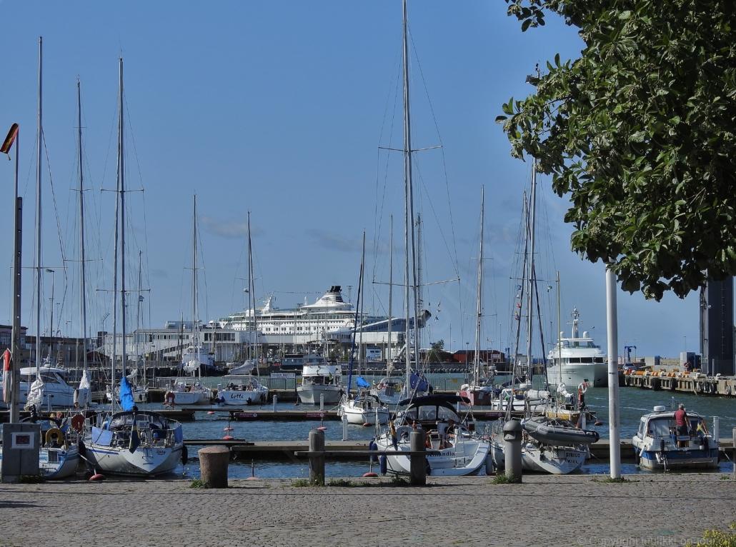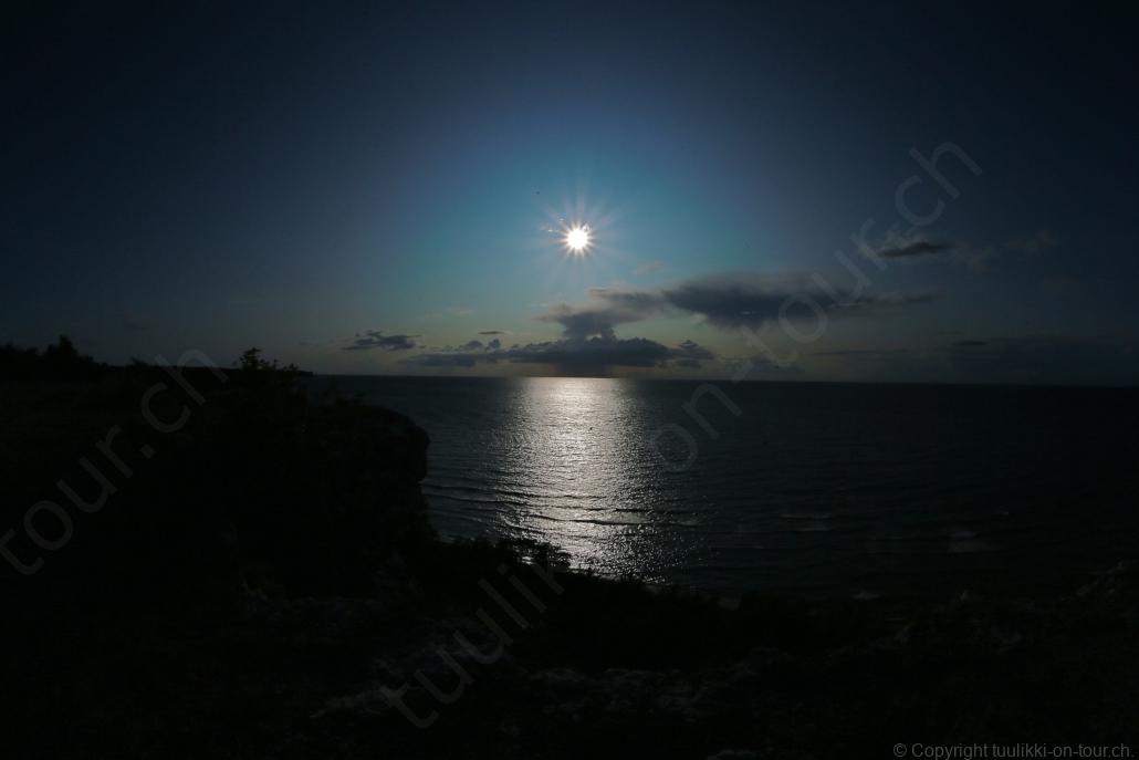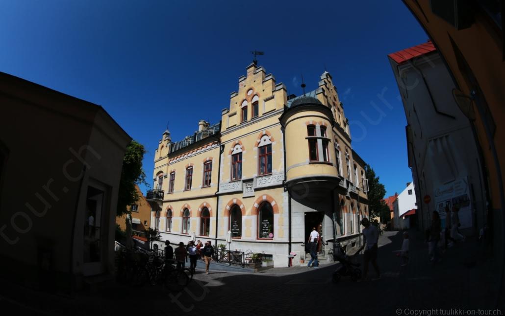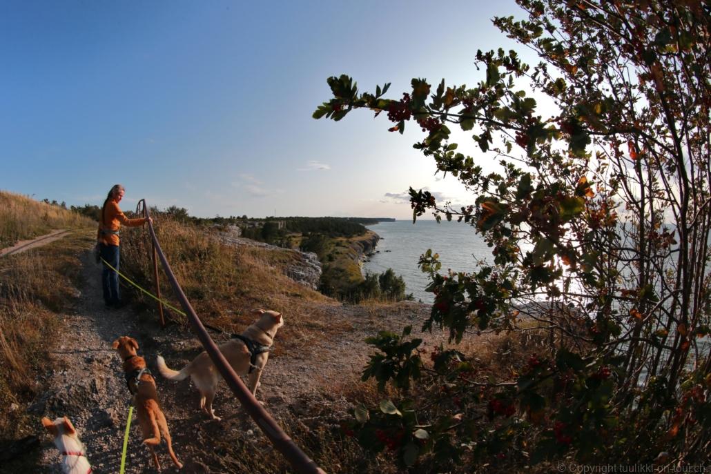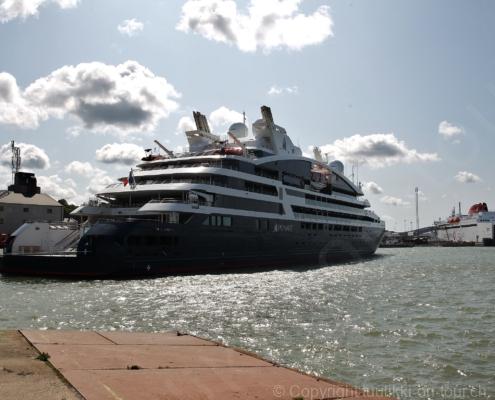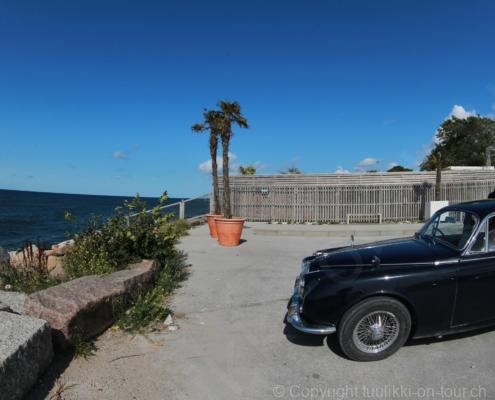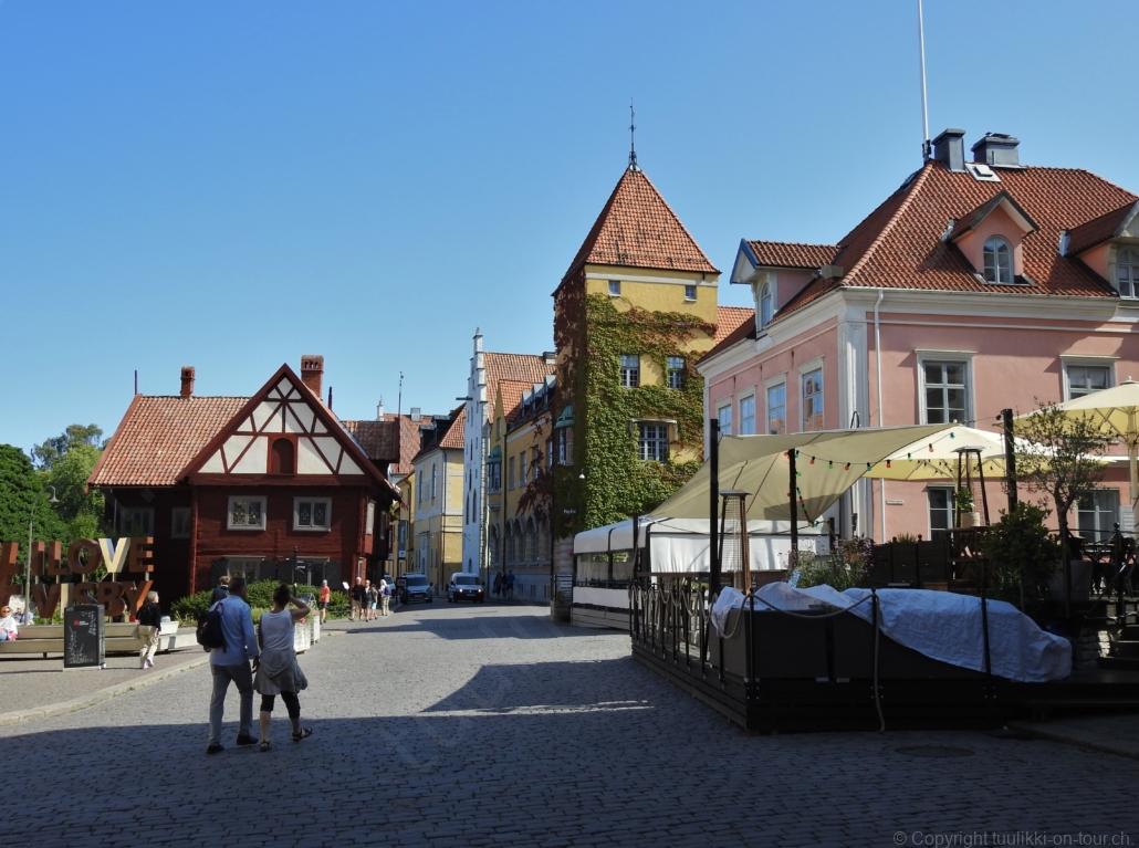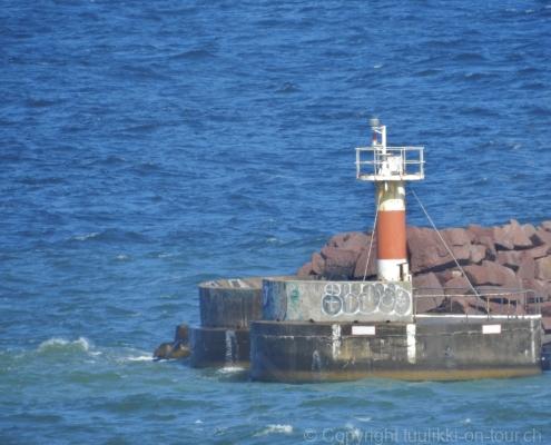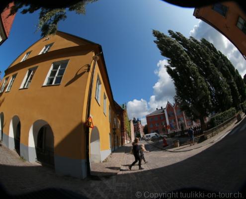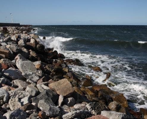 Am nächsten Morgen fahren wir zurück nach Visby. Es liegt ein grosses Kreuzfahrtschiff vor Anker und wir können mitverfolgen, wie – nebst der Fähre – noch ein weiteres einfährt. In Tourist Information holen wir Unterlagen und Informationen, um uns die Stadt noch etwas genauer anzuschauen. Es ist nicht mehr high-season und darum findet die Stadtführung nur noch täglich ein Mal um 11 Uhr statt … und jetzt sind sie schon ohne uns los. Dafür gibt es einen guten Stadtplan und Tipps wo wir durchspazieren und was wir unbedingt anschauen sollen. Zuerst aber fahren wir zum „Meeting Point“ beim Hafen, wo angrenzend ein Naturpark zum Spazieren einlädt. Verschiedene Wege führen der Küste entlang, was hier heisst, wir sind auf rund 40 m hohen Felsabhängen mit toller Aussicht auf die Ostsee und die ankommenden Schiffe. Über dem Parkplatz weht die Flagge Gotlands, ein stehender Widder mit goldener Kreuzstange auf blauem Grund. Zurück in die Stadt und eingestiegen in die „Bähnli-Tour“, welche mit Erklärungen ab Tonband rund um die Stadtmauer fährt. Danach geht es zu Fuss weiter zu den Ruinen, Fachwerkhäusern und in die Shopping-Gegend sowie in den Telia Shop (auch dort konnte man mir wegen dem nicht mehr funktionierenden WhatsApp nicht helfen!). Eindrücklich sind die Ruinen der St.Karin Kirche, neben der täglich ein Markt mit allerlei Ständen stattfindet. Dort wo der frühere, versandete Hafen war grünt jetzt ein Park mit speziellen Blumenrabatten. Es hat bestimmt für jeden Tag im Jahr ein Café oder Restaurant hier und alle sind kurz nach der Mittagszeit gut besetzt. Viele Touristen sind in der Stadt, die meisten wohl von den beiden riesigen Kreuzfahrtschiffen, die vor Anker liegen. Betonwidder als Strassensperren sind beliebt, es gibt sie im Souvenirshop auch klein und leicht. Besonders beliebt sind auch die Produkte aus der gekringelten Schafwolle des Gotlandschafs, dessen Wolle silbergrau bis dunkelbraun ist. Der Stadtrundgang über die Kopfsteinpflaster und an vielen Leuten vorbei macht müde. Wir fahren daher nur kurz aus der Stadt raus, um weiter südlich im Södra Hällarna Naturpark Stellung zu beziehen, die vielen Kaninchen zu beobachten und unsere Hunde im Zaum zu halten, die diesen unbedingt nachschnüffeln wollen. Seit langem können wir wieder einen schönen orangen Sonnenuntergang über der Ostsee mitverfolgen.