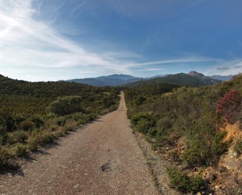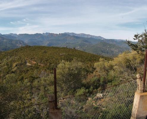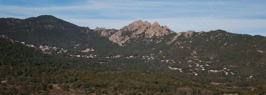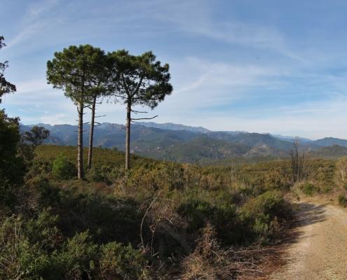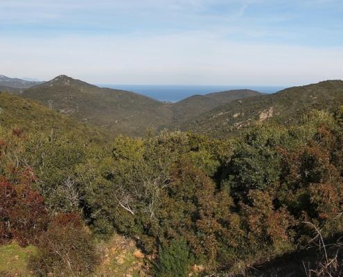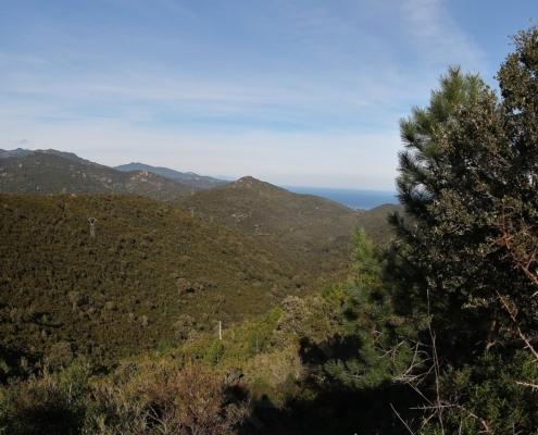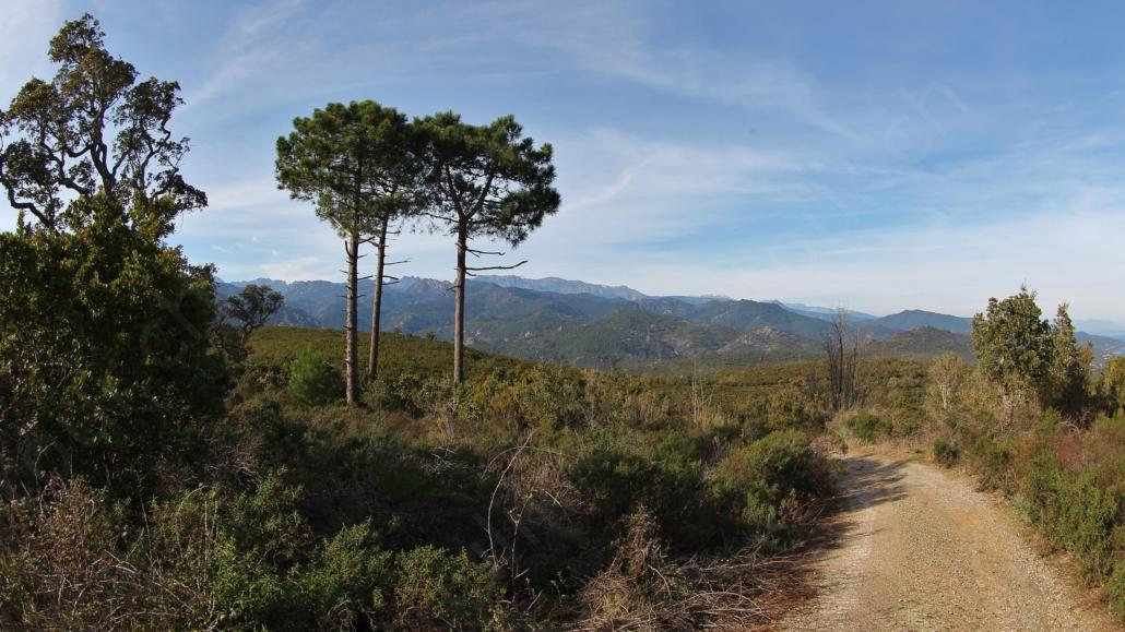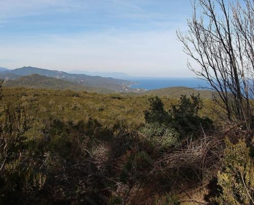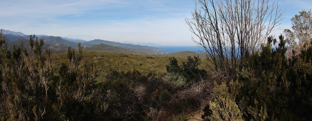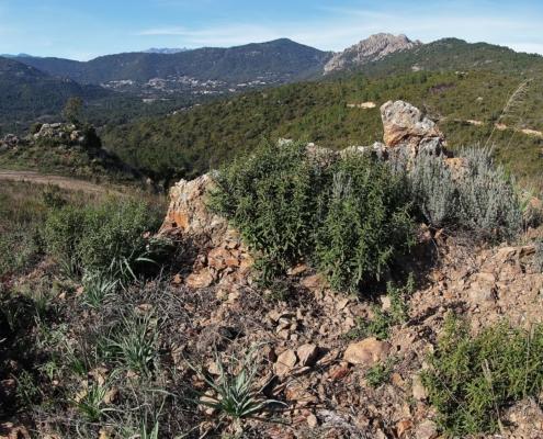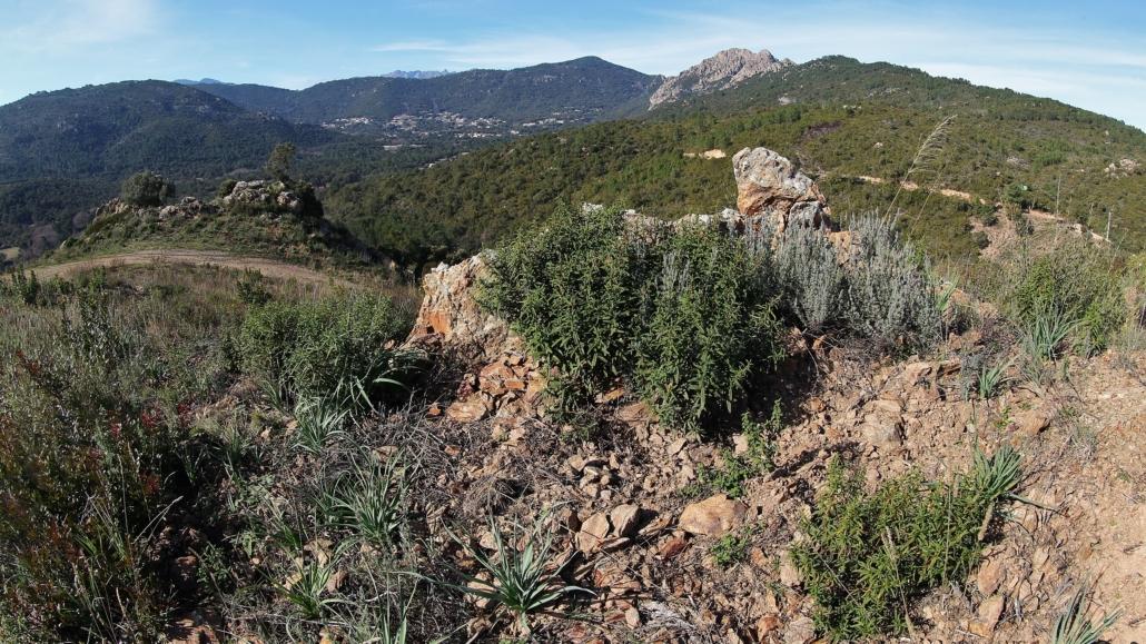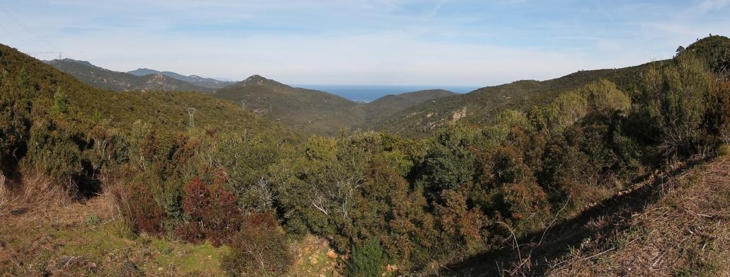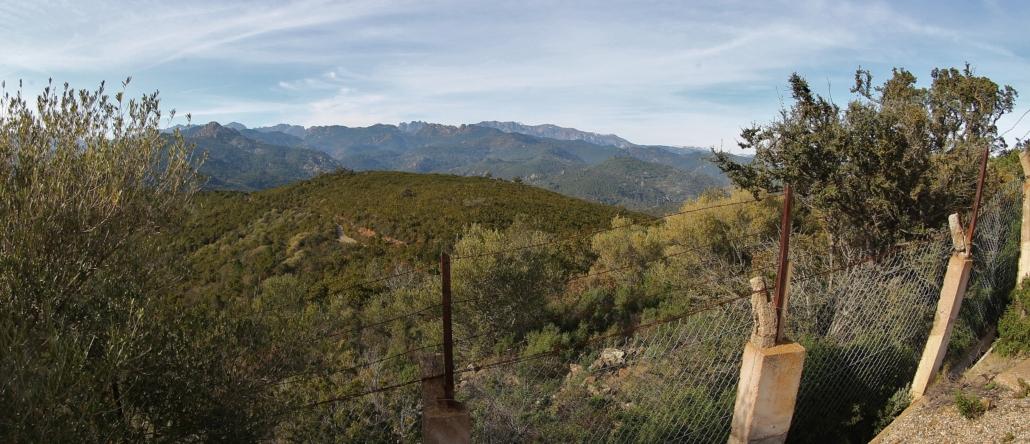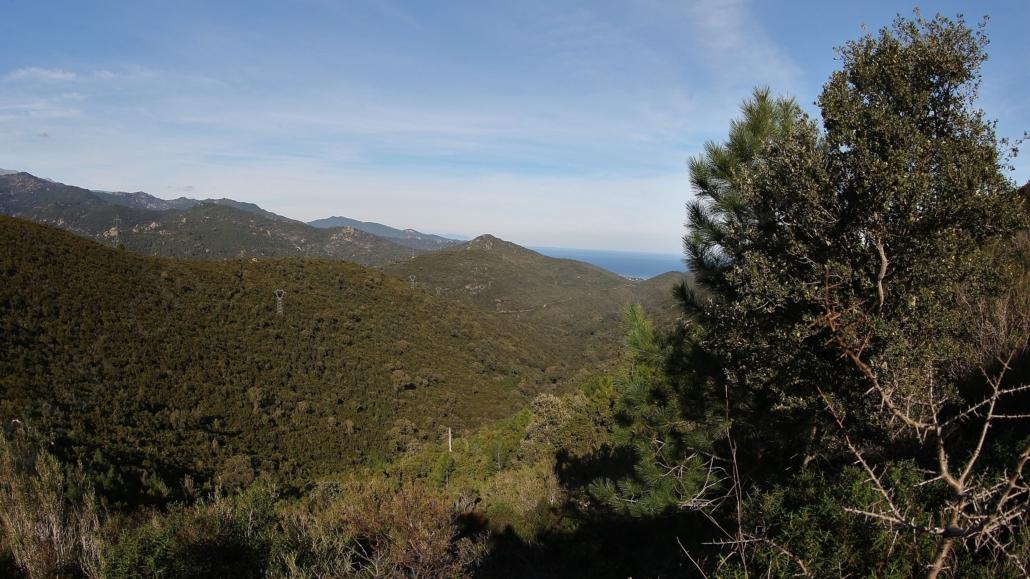 Wir besuchen den Friedhof und die Dorf-Kirche von Conca, die markant, mitten ‘im Weg’ steht, so dass sich die Strasse hier gabelt. Dann fahren wir zwischen den eng beieinanderstehenden Häusern durch. Der kurvigen Hauptstrasse folgend, zeigen sich einige durch die Macchia führende Seitenwege, die sich als Unterhalts-Trassees zu den im Dickicht thronenden Strommasten entpuppen. Wir stellen den Idefix in eine Ecke und folgen einem solchen Weg mitten durch die Macchia. Es ist warm, einsam und still, nur das Summen der Insekten und ab und zu ein Vogel ist zu hören. Diese unsagbar herrliche Ungestörtheit und Ruhe wird nur durch das eigene Schrittgeräusch beeinträchtigt. Entlang des Weges duftet es schon ansatzweise nach Frühling und blühenden Gebüschen. Tatsächlich sind auch die ersten Lavendelblüten geöffnet. Zahlreiche leere Patronenhülsen liegen verstreut herum, vermutlich von der Jagd auf die kleinen, scheuen korsischen Wildschweine (U cignale), die sich von Kastanien, Eicheln und Trüffeln ernähren. Links und rechts schnüffelnd folgen uns die Hunde bis zu einem Umsetzer auf dem äussersten Hügel gegen das Meer hin. Eine super Weitsicht wird von hier geboten. Zwar ist es leicht dunstig aber die Aussicht vom vordersten Umsetzer ‘aria puzzosa’ aus bis zu den Schneebergen resp. hinunter zu dem unglaublichen Blau der Meeresgestaden ist trotzdem fantastisch.