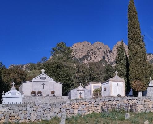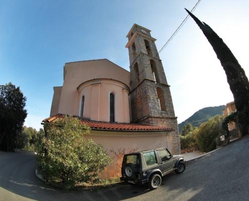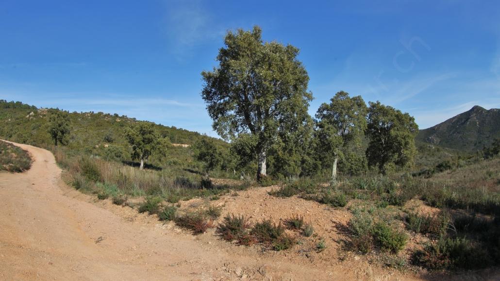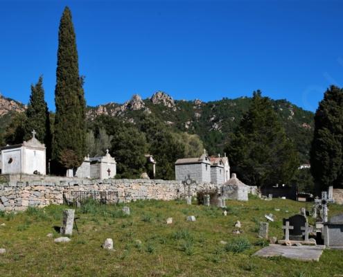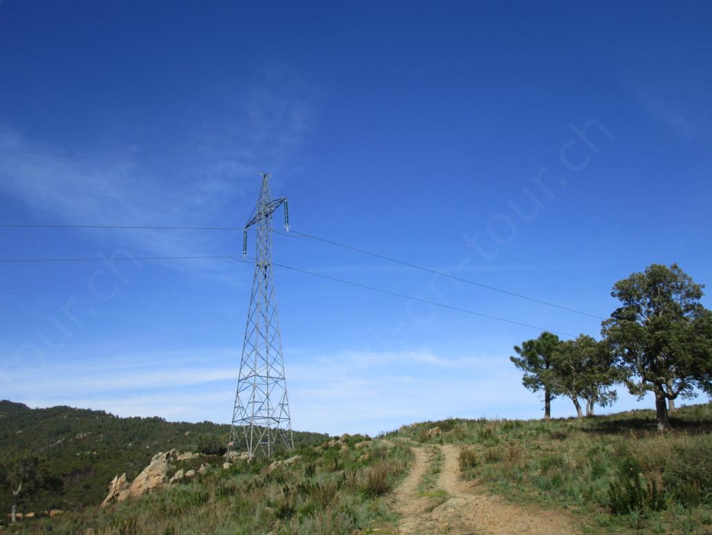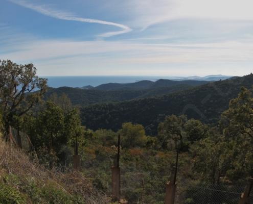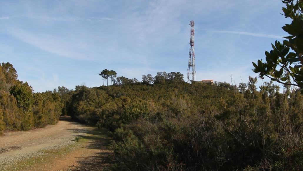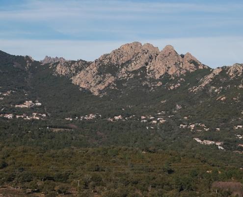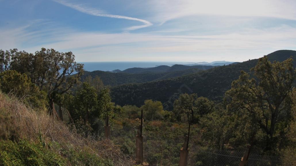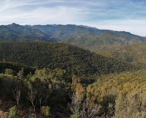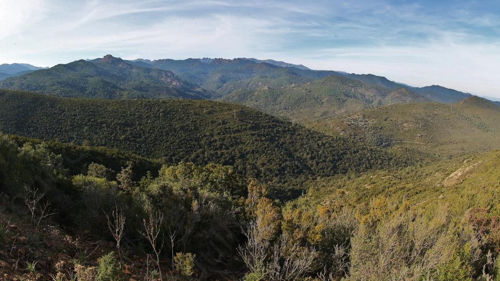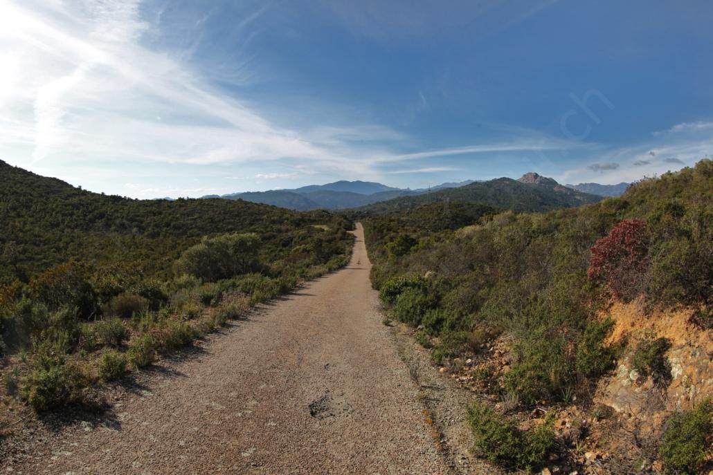 Wir besuchen den Friedhof und die Dorf-Kirche von Conca, die markant, mitten ‘im Weg’ steht, so dass sich die Strasse hier gabelt. Dann fahren wir zwischen den eng beieinanderstehenden Häusern durch. Der kurvigen Hauptstrasse folgend, zeigen sich einige durch die Macchia führende Seitenwege, die sich als Unterhalts-Trassees zu den im Dickicht thronenden Strommasten entpuppen. Wir stellen den Idefix in eine Ecke und folgen einem solchen Weg mitten durch die Macchia. Es ist warm, einsam und still, nur das Summen der Insekten und ab und zu ein Vogel ist zu hören. Diese unsagbar herrliche Ungestörtheit und Ruhe wird nur durch das eigene Schrittgeräusch beeinträchtigt. Entlang des Weges duftet es schon ansatzweise nach Frühling und blühenden Gebüschen. Tatsächlich sind auch die ersten Lavendelblüten geöffnet. Zahlreiche leere Patronenhülsen liegen verstreut herum, vermutlich von der Jagd auf die kleinen, scheuen korsischen Wildschweine (U cignale), die sich von Kastanien, Eicheln und Trüffeln ernähren. Links und rechts schnüffelnd folgen uns die Hunde bis zu einem Umsetzer auf dem äussersten Hügel gegen das Meer hin. Eine super Weitsicht wird von hier geboten. Zwar ist es leicht dunstig aber die Aussicht vom vordersten Umsetzer ‘aria puzzosa’ aus bis zu den Schneebergen resp. hinunter zu dem unglaublichen Blau der Meeresgestaden ist trotzdem fantastisch.