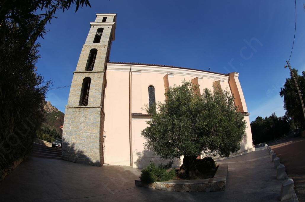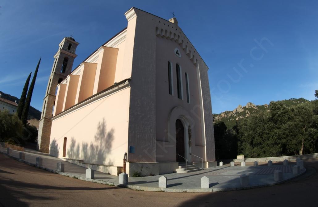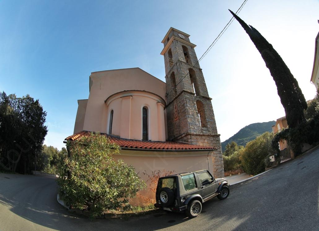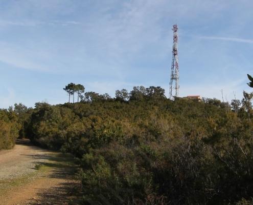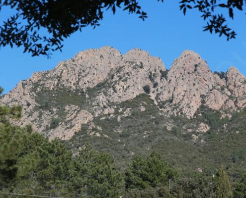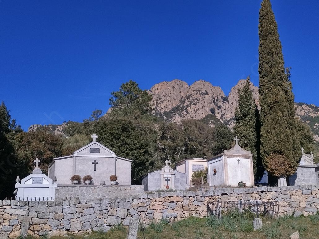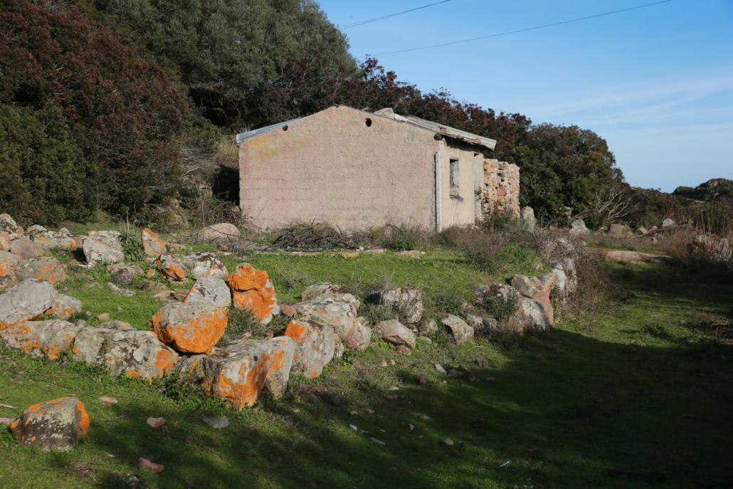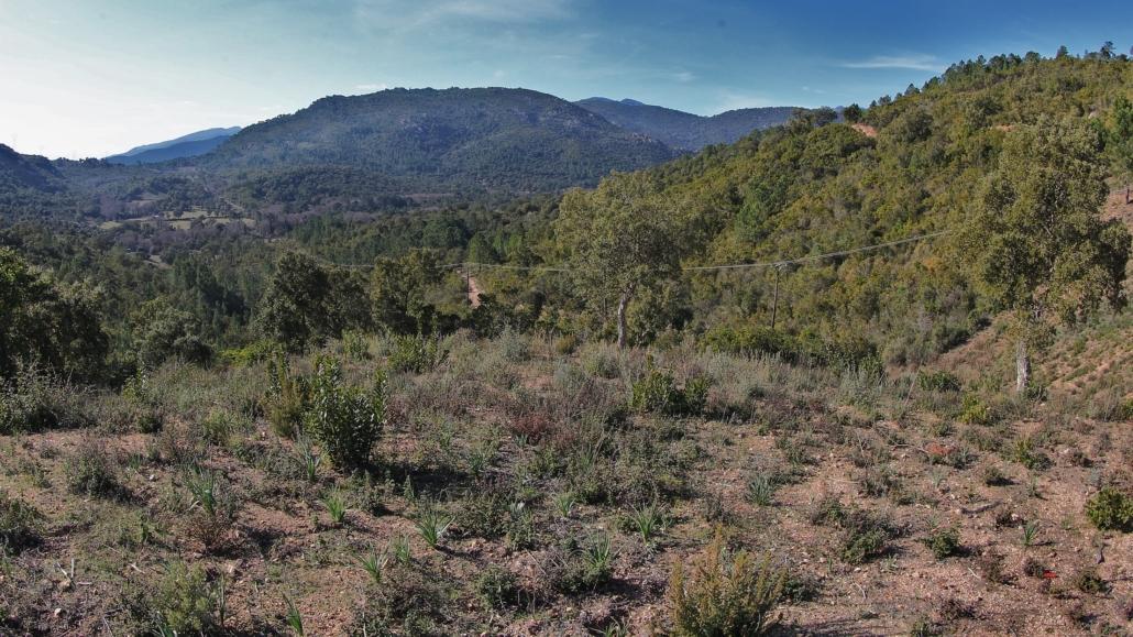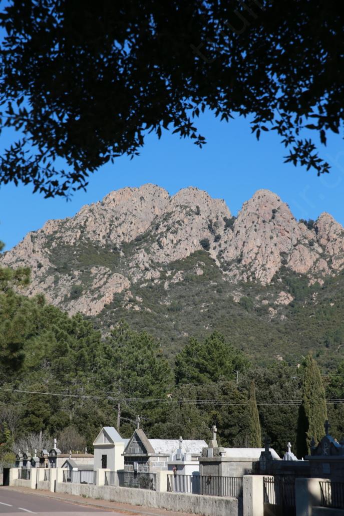 Wir besuchen den Friedhof und die Dorf-Kirche von Conca, die markant, mitten ‘im Weg’ steht, so dass sich die Strasse hier gabelt. Dann fahren wir zwischen den eng beieinanderstehenden Häusern durch. Der kurvigen Hauptstrasse folgend, zeigen sich einige durch die Macchia führende Seitenwege, die sich als Unterhalts-Trassees zu den im Dickicht thronenden Strommasten entpuppen. Wir stellen den Idefix in eine Ecke und folgen einem solchen Weg mitten durch die Macchia. Es ist warm, einsam und still, nur das Summen der Insekten und ab und zu ein Vogel ist zu hören. Diese unsagbar herrliche Ungestörtheit und Ruhe wird nur durch das eigene Schrittgeräusch beeinträchtigt. Entlang des Weges duftet es schon ansatzweise nach Frühling und blühenden Gebüschen. Tatsächlich sind auch die ersten Lavendelblüten geöffnet. Zahlreiche leere Patronenhülsen liegen verstreut herum, vermutlich von der Jagd auf die kleinen, scheuen korsischen Wildschweine (U cignale), die sich von Kastanien, Eicheln und Trüffeln ernähren. Links und rechts schnüffelnd folgen uns die Hunde bis zu einem Umsetzer auf dem äussersten Hügel gegen das Meer hin. Eine super Weitsicht wird von hier geboten. Zwar ist es leicht dunstig aber die Aussicht vom vordersten Umsetzer ‘aria puzzosa’ aus bis zu den Schneebergen resp. hinunter zu dem unglaublichen Blau der Meeresgestaden ist trotzdem fantastisch.