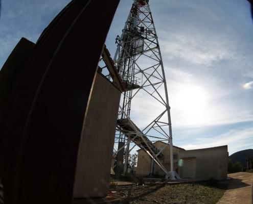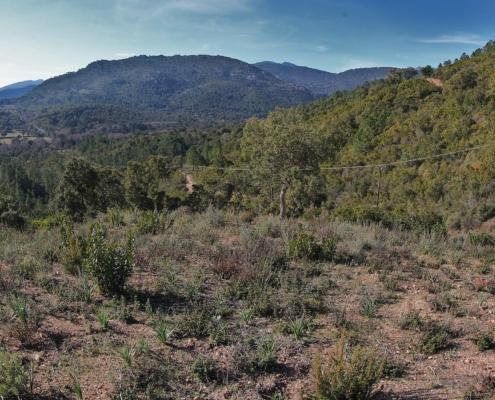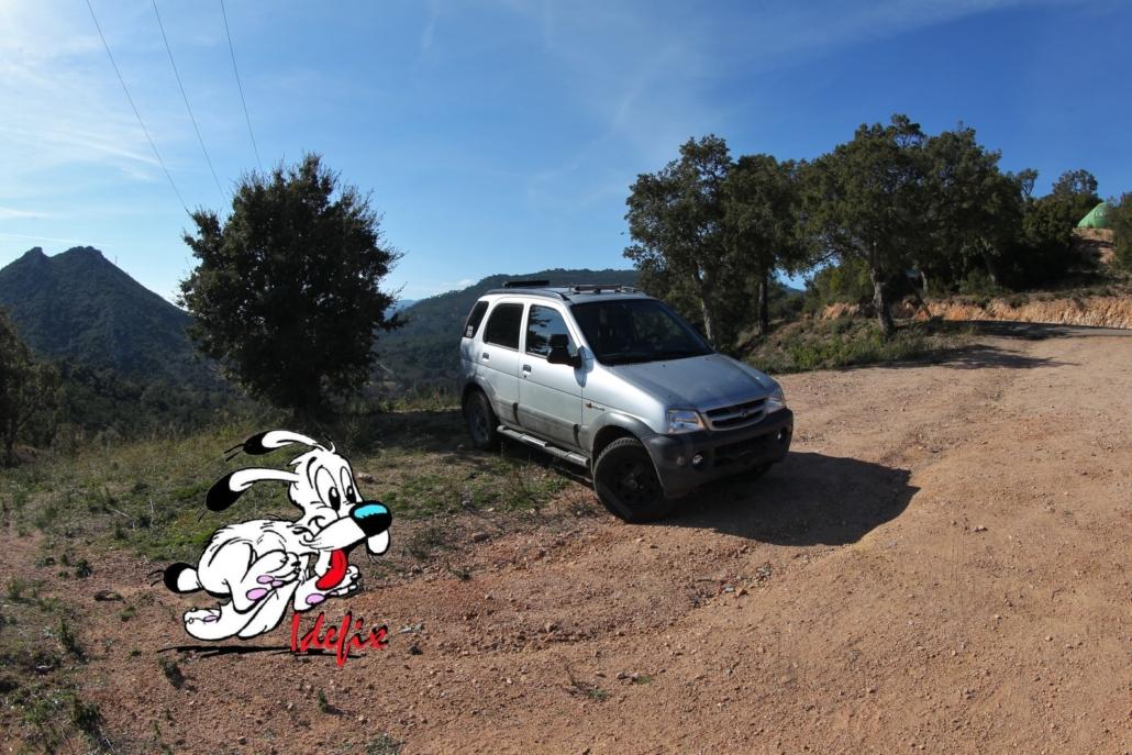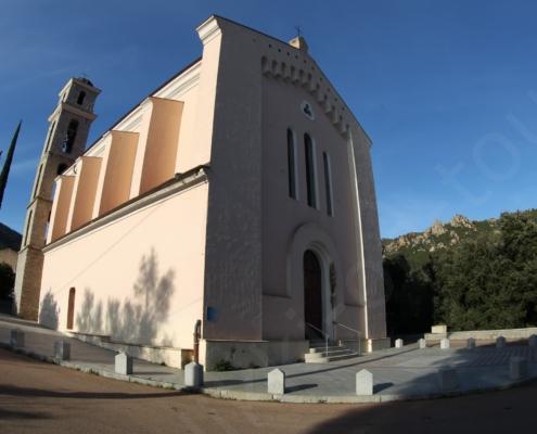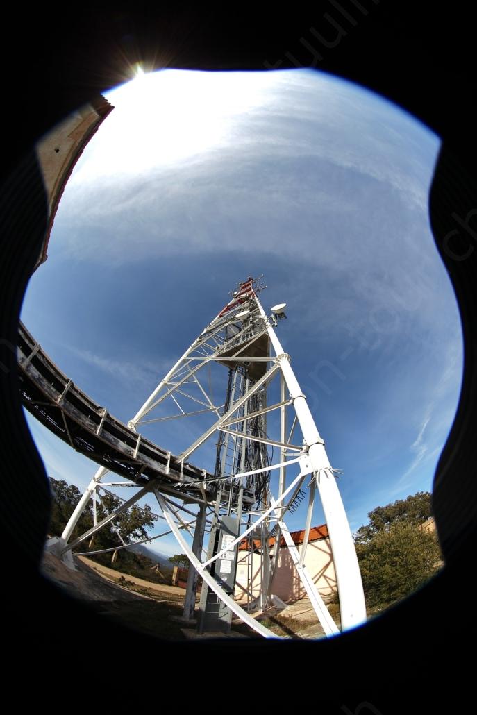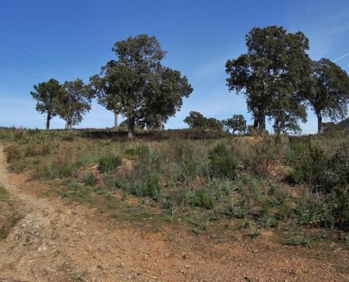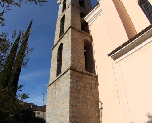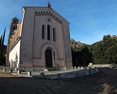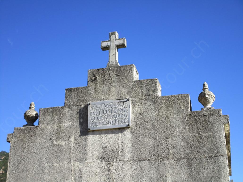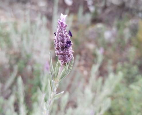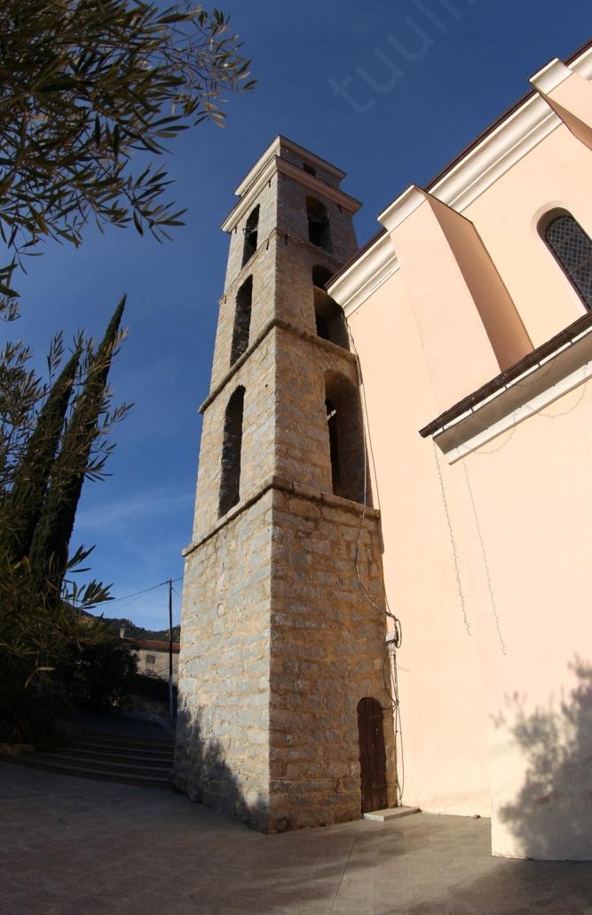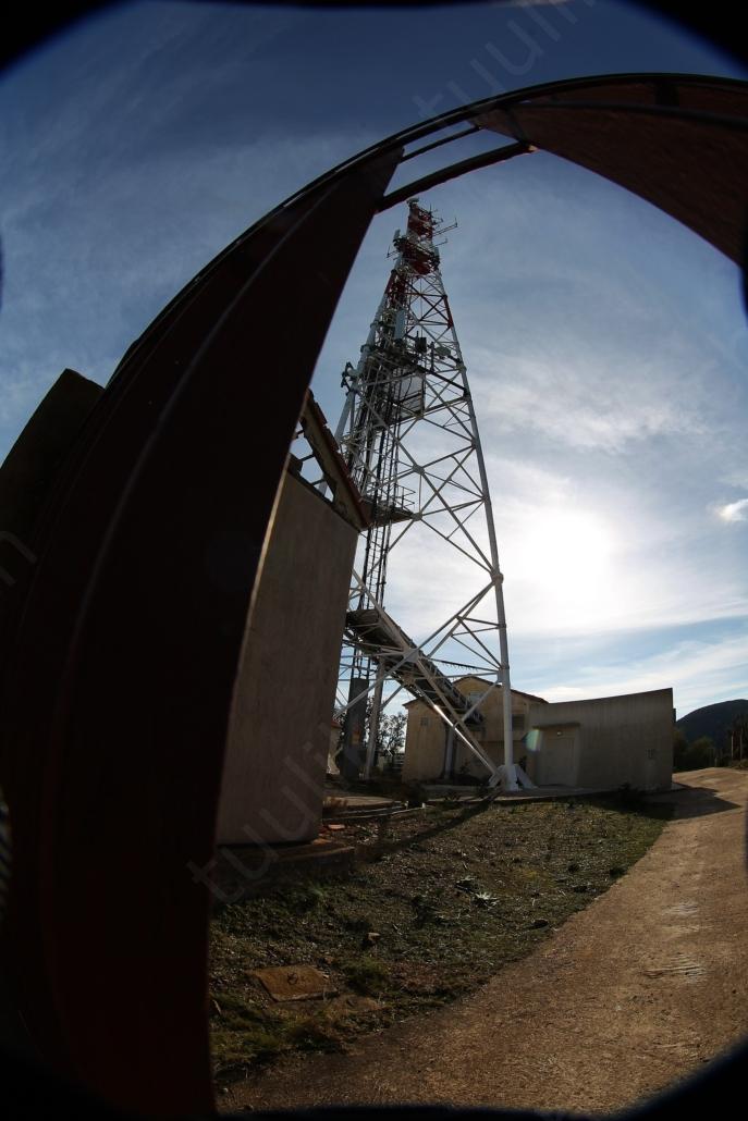 Wir besuchen den Friedhof und die Dorf-Kirche von Conca, die markant, mitten ‘im Weg’ steht, so dass sich die Strasse hier gabelt. Dann fahren wir zwischen den eng beieinanderstehenden Häusern durch. Der kurvigen Hauptstrasse folgend, zeigen sich einige durch die Macchia führende Seitenwege, die sich als Unterhalts-Trassees zu den im Dickicht thronenden Strommasten entpuppen. Wir stellen den Idefix in eine Ecke und folgen einem solchen Weg mitten durch die Macchia. Es ist warm, einsam und still, nur das Summen der Insekten und ab und zu ein Vogel ist zu hören. Diese unsagbar herrliche Ungestörtheit und Ruhe wird nur durch das eigene Schrittgeräusch beeinträchtigt. Entlang des Weges duftet es schon ansatzweise nach Frühling und blühenden Gebüschen. Tatsächlich sind auch die ersten Lavendelblüten geöffnet. Zahlreiche leere Patronenhülsen liegen verstreut herum, vermutlich von der Jagd auf die kleinen, scheuen korsischen Wildschweine (U cignale), die sich von Kastanien, Eicheln und Trüffeln ernähren. Links und rechts schnüffelnd folgen uns die Hunde bis zu einem Umsetzer auf dem äussersten Hügel gegen das Meer hin. Eine super Weitsicht wird von hier geboten. Zwar ist es leicht dunstig aber die Aussicht vom vordersten Umsetzer ‘aria puzzosa’ aus bis zu den Schneebergen resp. hinunter zu dem unglaublichen Blau der Meeresgestaden ist trotzdem fantastisch.