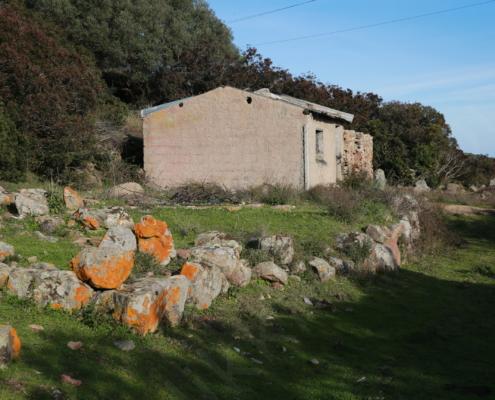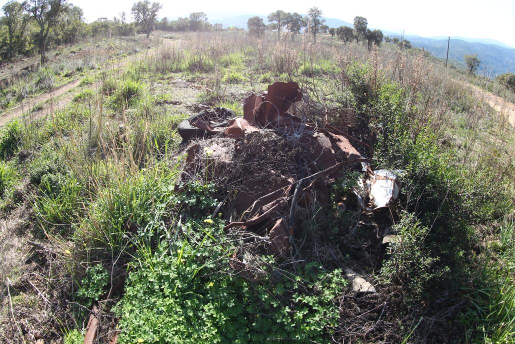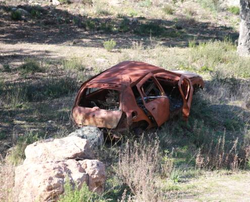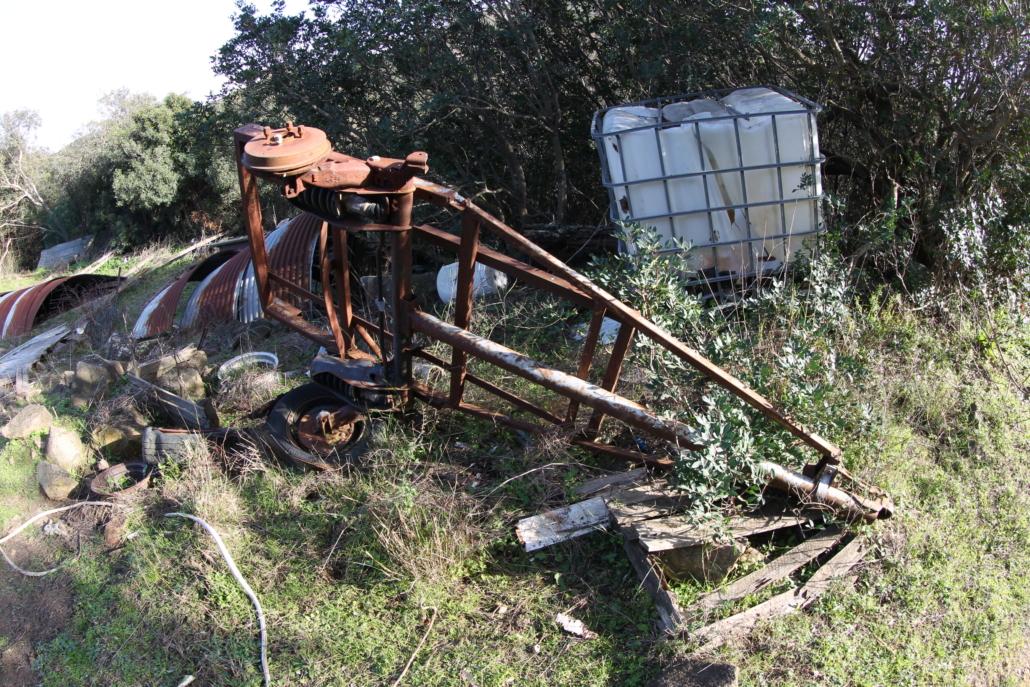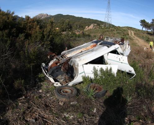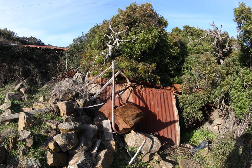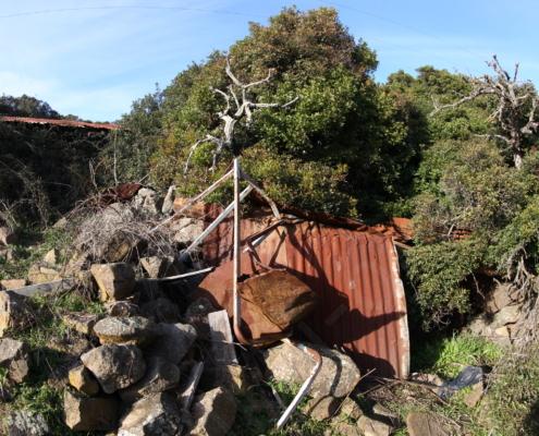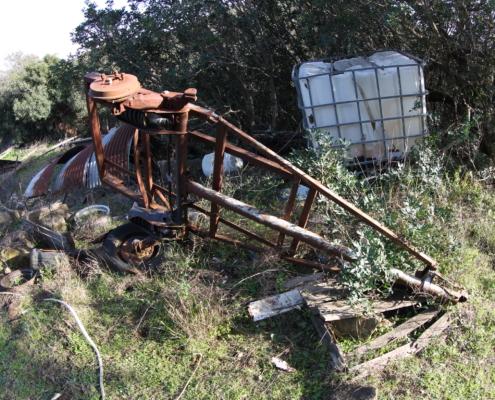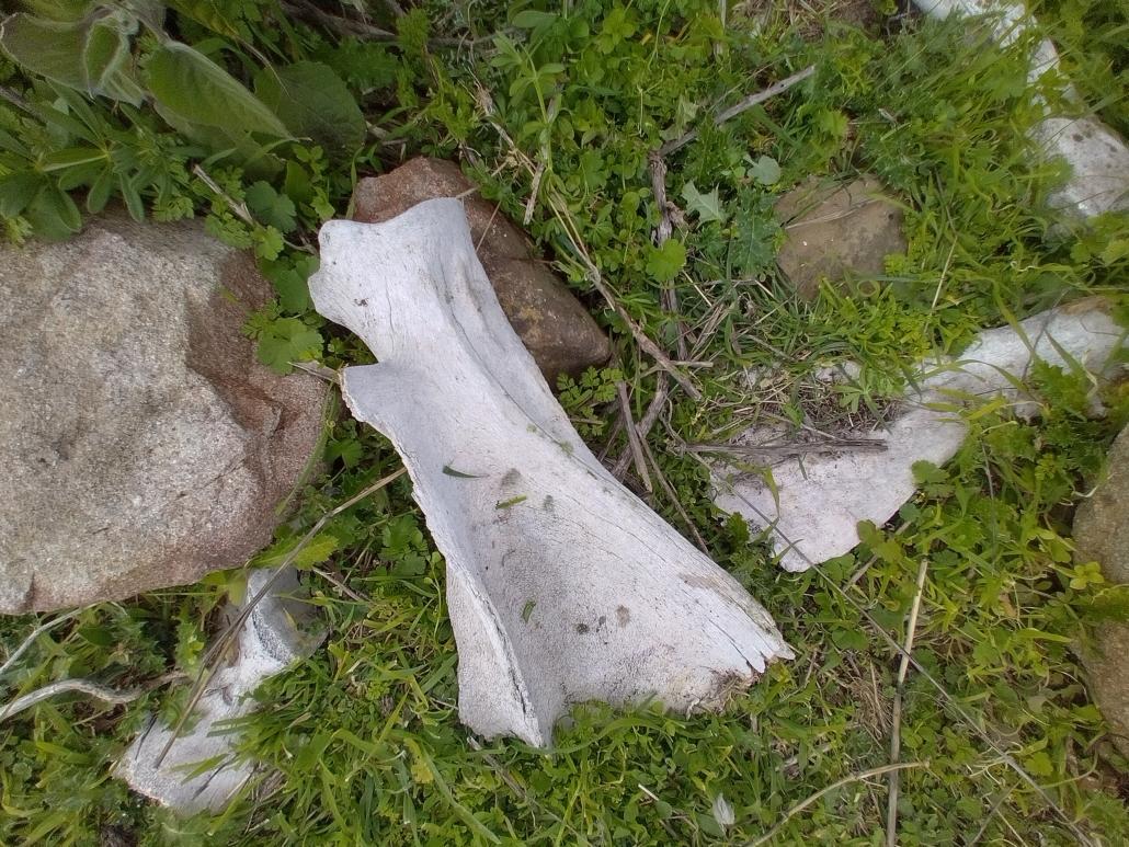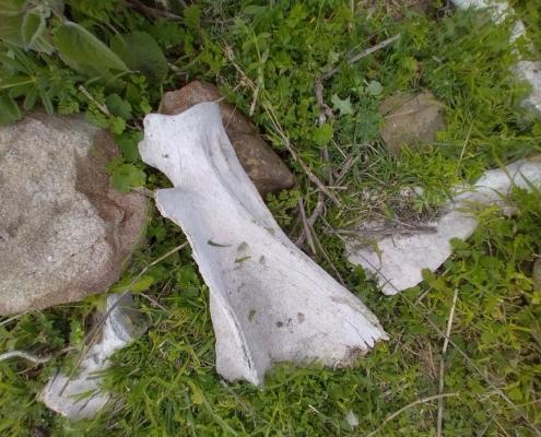 Wir erkunden auf dem Rückweg ein Gebäude zu dem ein steiler Weg hinaufführt. Es handelt sich offenbar um einen ehemaligen Stall, von dem nur noch Blechdachresten auszumachen sind und um ein verfallendes kleines Wohngebäude an bester Sonnenlage. Verstreut liegen grosse Tierknochen herum und im Gebüsch liegen einige vor sich hin rostende alte Fahrzeuge. Wie die wohl dahingekommen sind?