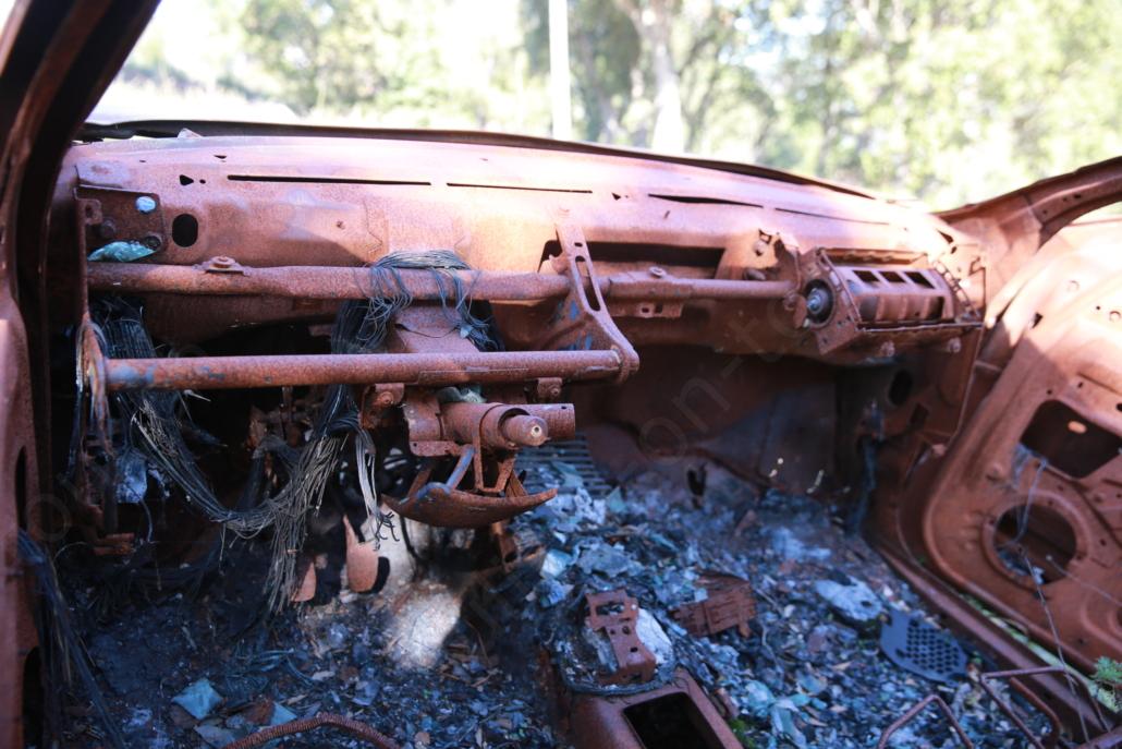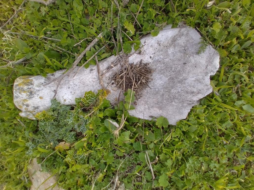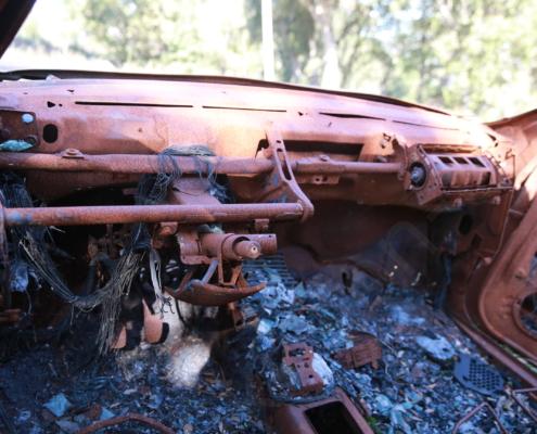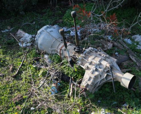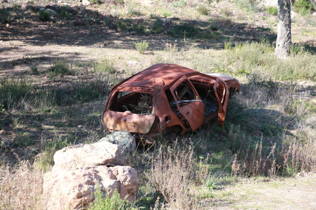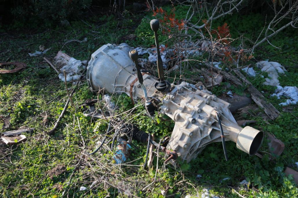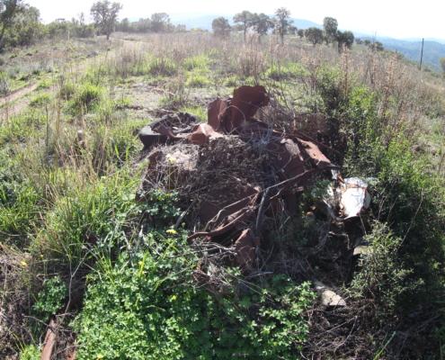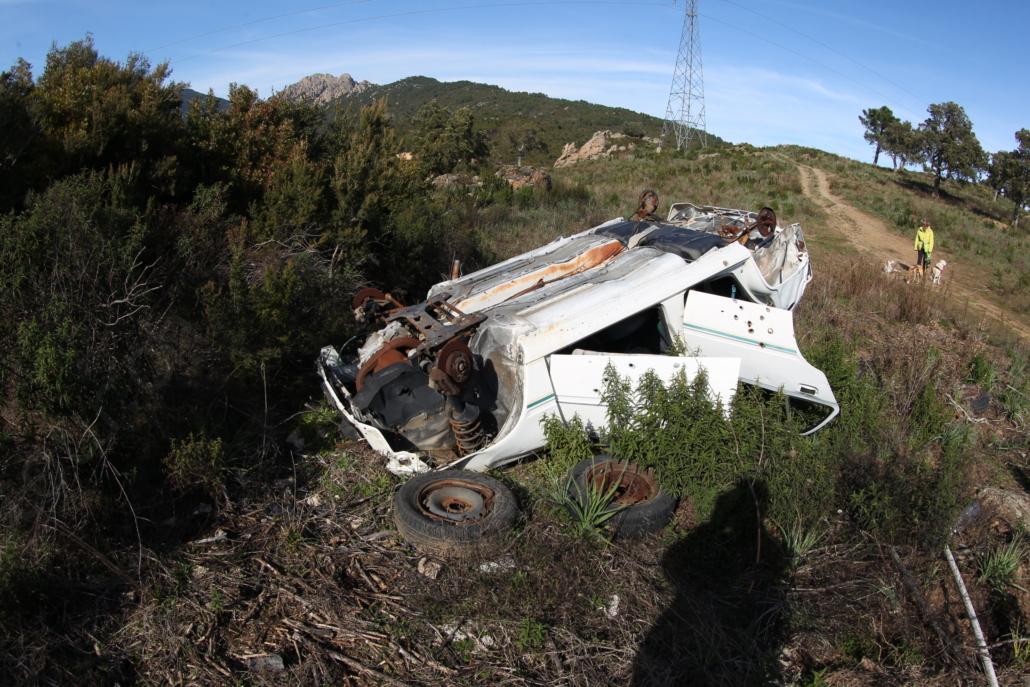 Wir erkunden auf dem Rückweg ein Gebäude zu dem ein steiler Weg hinaufführt. Es handelt sich offenbar um einen ehemaligen Stall, von dem nur noch Blechdachresten auszumachen sind und um ein verfallendes kleines Wohngebäude an bester Sonnenlage. Verstreut liegen grosse Tierknochen herum und im Gebüsch liegen einige vor sich hin rostende alte Fahrzeuge. Wie die wohl dahingekommen sind?