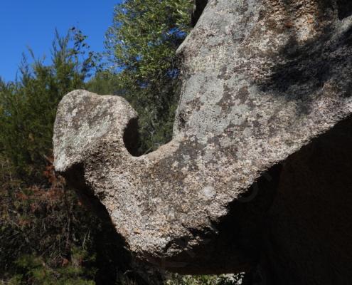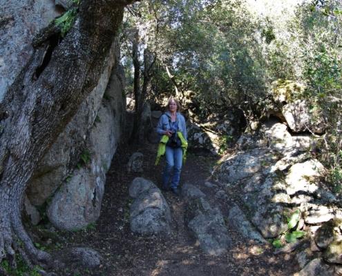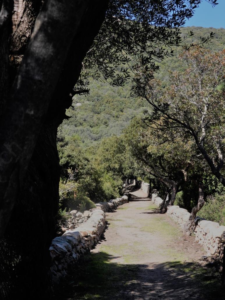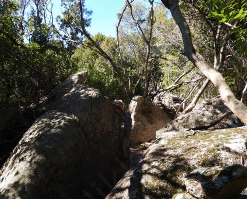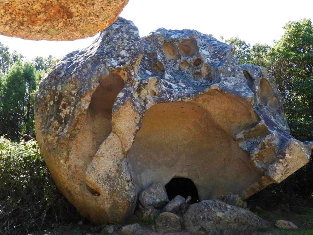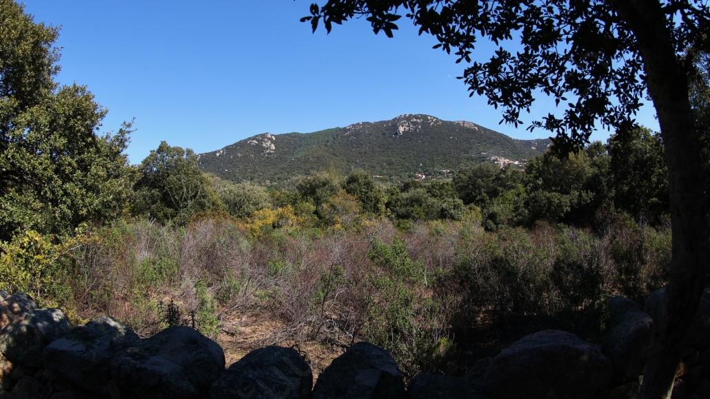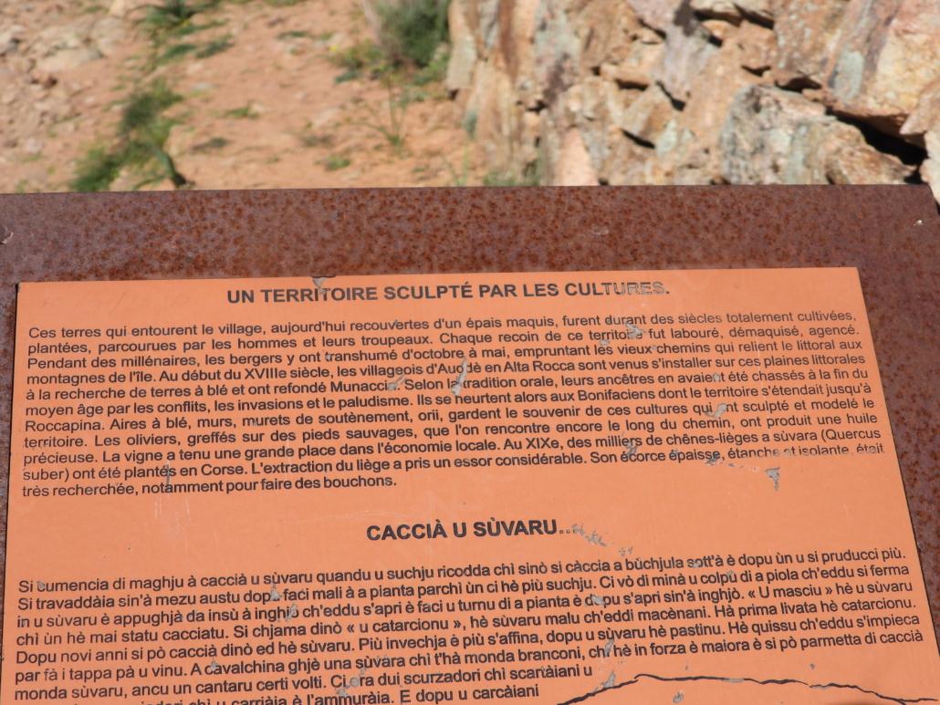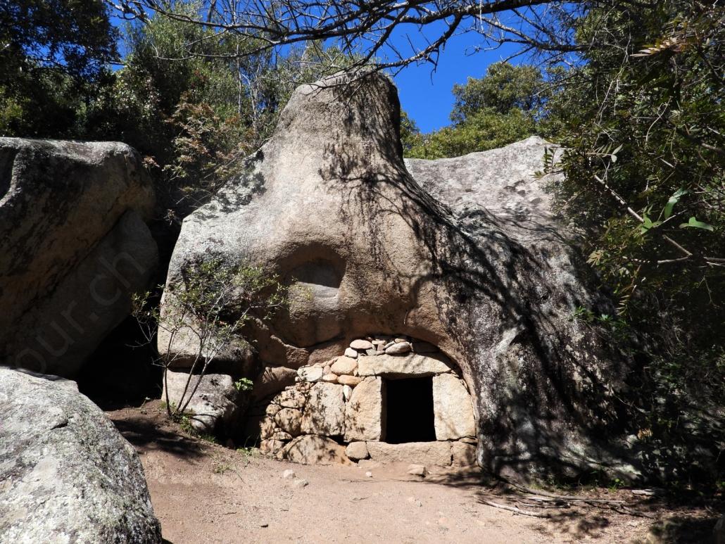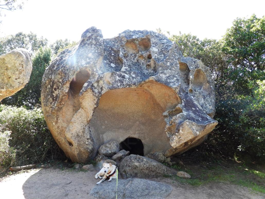 Wir sind hierher gefahren, weil uns der «Sentier du Patrimoine de Monacia-d’Aullène» von verschiedenen Seiten her empfohlen wurde. Und tatsächlich treffen wir an einem wolkenlosen, warmen Wochentag einen von Naturstein-Mauern eingefassten, schönen, abwechslungsreichen und informativen Rundweg. Zuerst geht es an den Bach runter, kurz diesem entlang – ideal für unsere Vierbeiner um nochmals ‘Markierungsflüssigkeit’ aufzunehmen – und dann über eine Holzbrücke. Ab hier geht es leicht bergauf, vorbei an knorrigen Baumstämmen und Felsen mit faszinierenden Formen und Farben. Oben angekommen treffen wir auf ein malerisches Oriu. Die aus ‘tafoni’ (Grotten) gebauten Unterstände dienten je nach Epoche als Wohnung, Grab oder Kornsilo. Dieses Oriu ist in gutem Zustand und bewerkenswert einladend sowie mit schöner Aussicht ins Tal.