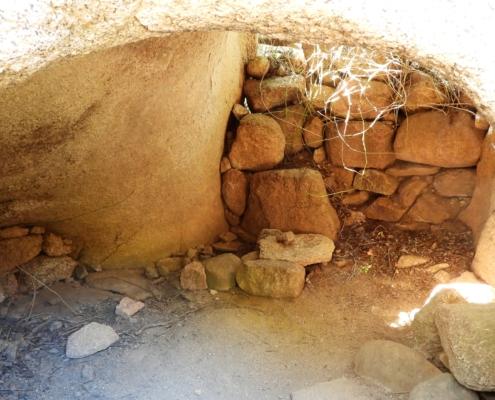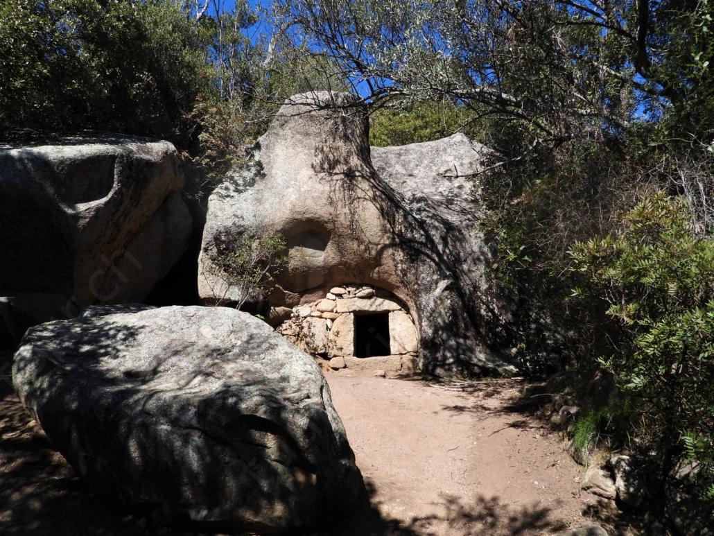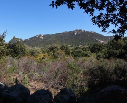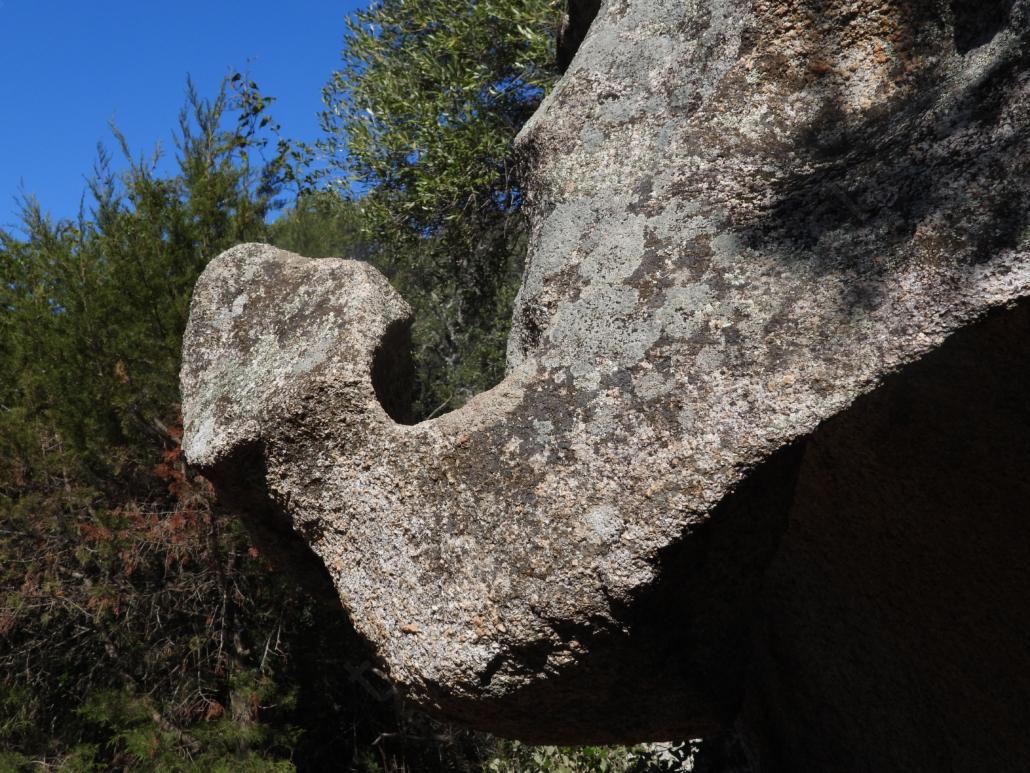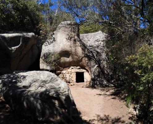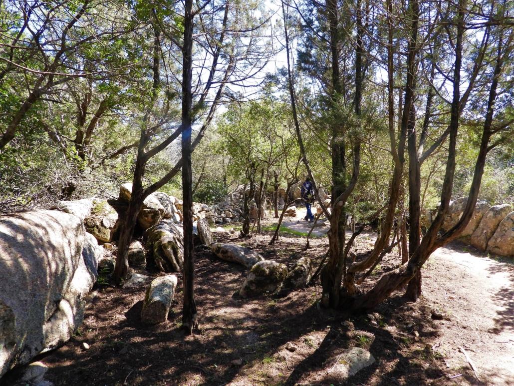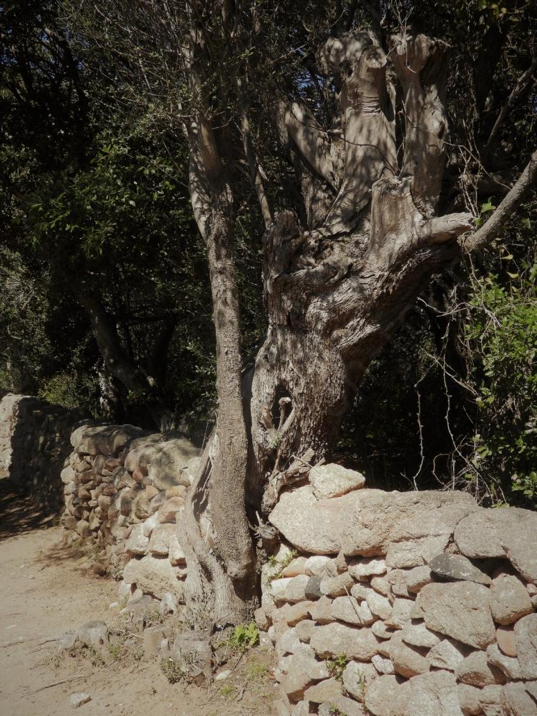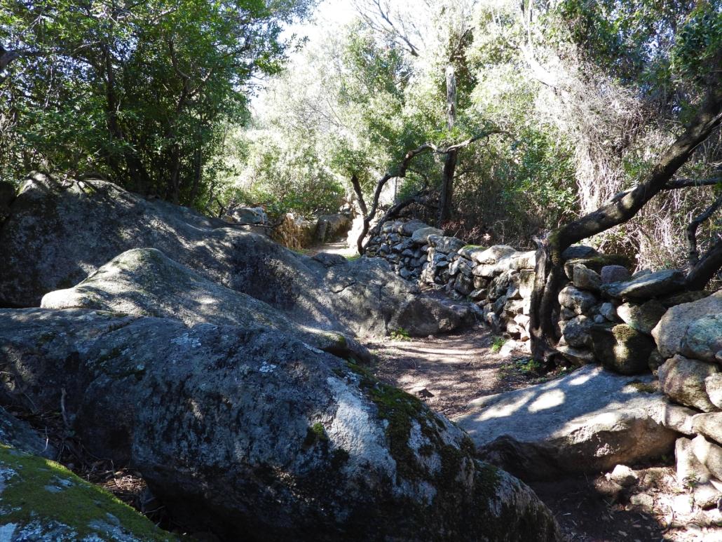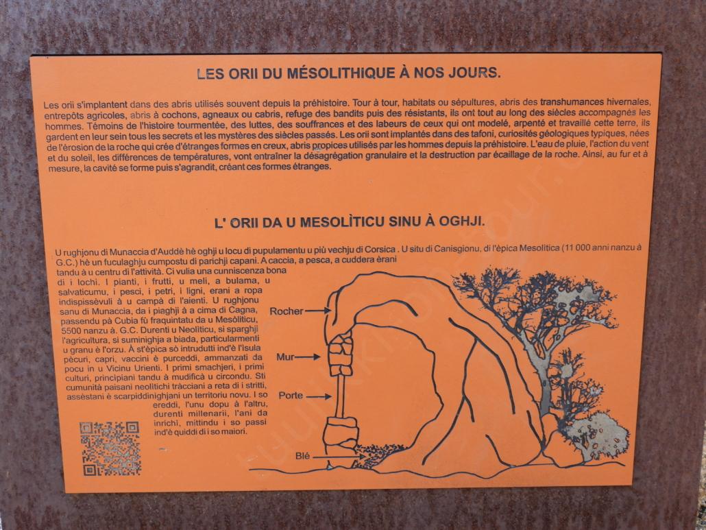 Wir sind hierher gefahren, weil uns der «Sentier du Patrimoine de Monacia-d’Aullène» von verschiedenen Seiten her empfohlen wurde. Und tatsächlich treffen wir an einem wolkenlosen, warmen Wochentag einen von Naturstein-Mauern eingefassten, schönen, abwechslungsreichen und informativen Rundweg. Zuerst geht es an den Bach runter, kurz diesem entlang – ideal für unsere Vierbeiner um nochmals ‘Markierungsflüssigkeit’ aufzunehmen – und dann über eine Holzbrücke. Ab hier geht es leicht bergauf, vorbei an knorrigen Baumstämmen und Felsen mit faszinierenden Formen und Farben. Oben angekommen treffen wir auf ein malerisches Oriu. Die aus ‘tafoni’ (Grotten) gebauten Unterstände dienten je nach Epoche als Wohnung, Grab oder Kornsilo. Dieses Oriu ist in gutem Zustand und bewerkenswert einladend sowie mit schöner Aussicht ins Tal.