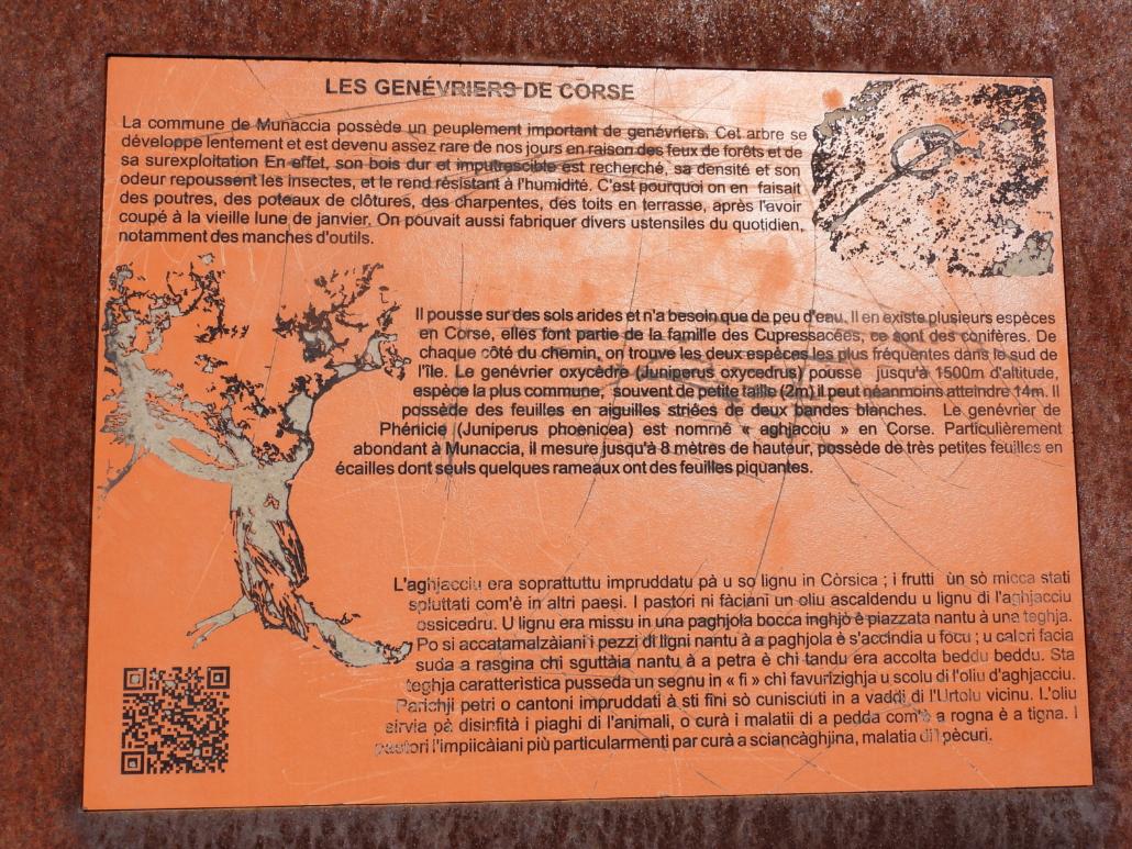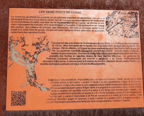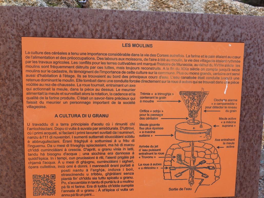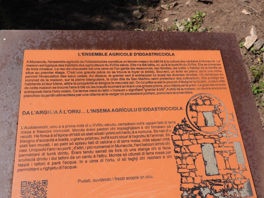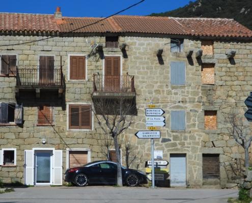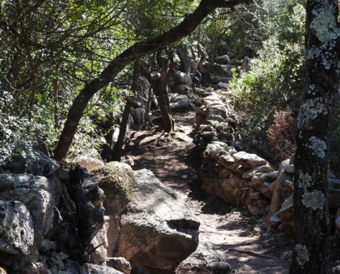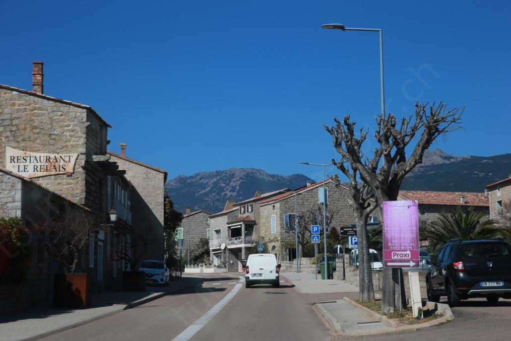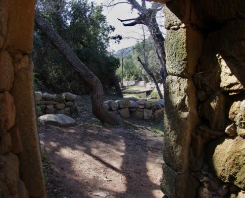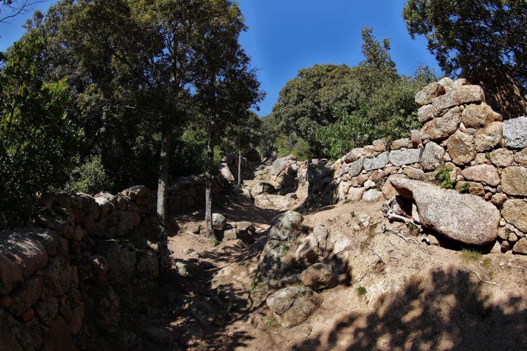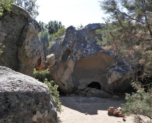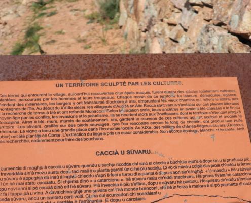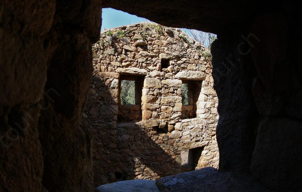 Wir sind hierher gefahren, weil uns der «Sentier du Patrimoine de Monacia-d’Aullène» von verschiedenen Seiten her empfohlen wurde. Und tatsächlich treffen wir an einem wolkenlosen, warmen Wochentag einen von Naturstein-Mauern eingefassten, schönen, abwechslungsreichen und informativen Rundweg. Zuerst geht es an den Bach runter, kurz diesem entlang – ideal für unsere Vierbeiner um nochmals ‘Markierungsflüssigkeit’ aufzunehmen – und dann über eine Holzbrücke. Ab hier geht es leicht bergauf, vorbei an knorrigen Baumstämmen und Felsen mit faszinierenden Formen und Farben. Oben angekommen treffen wir auf ein malerisches Oriu. Die aus ‘tafoni’ (Grotten) gebauten Unterstände dienten je nach Epoche als Wohnung, Grab oder Kornsilo. Dieses Oriu ist in gutem Zustand und bewerkenswert einladend sowie mit schöner Aussicht ins Tal.