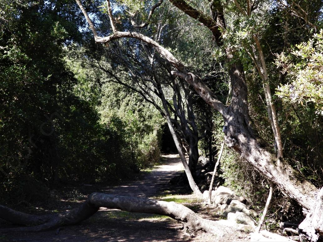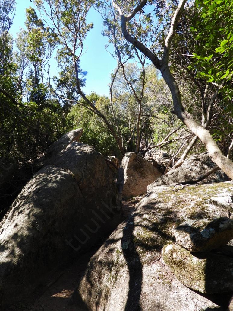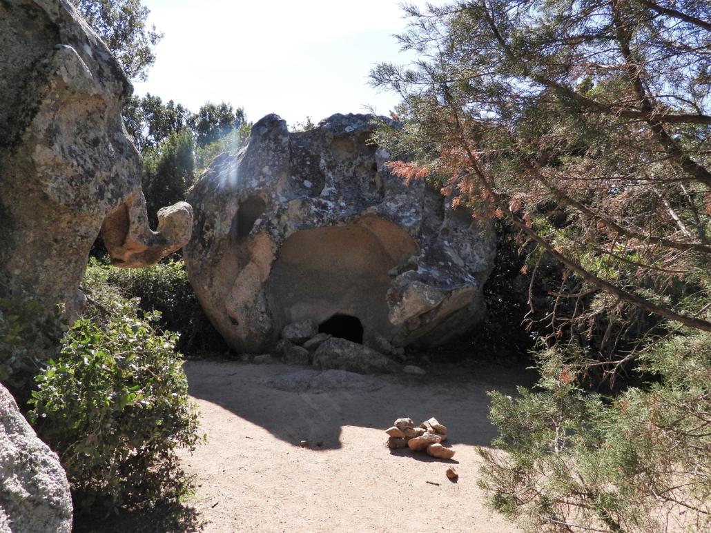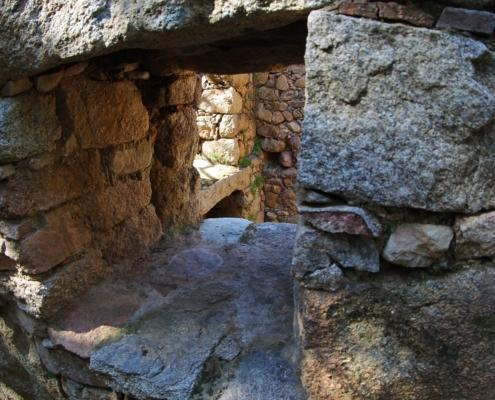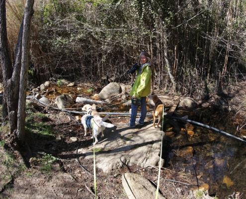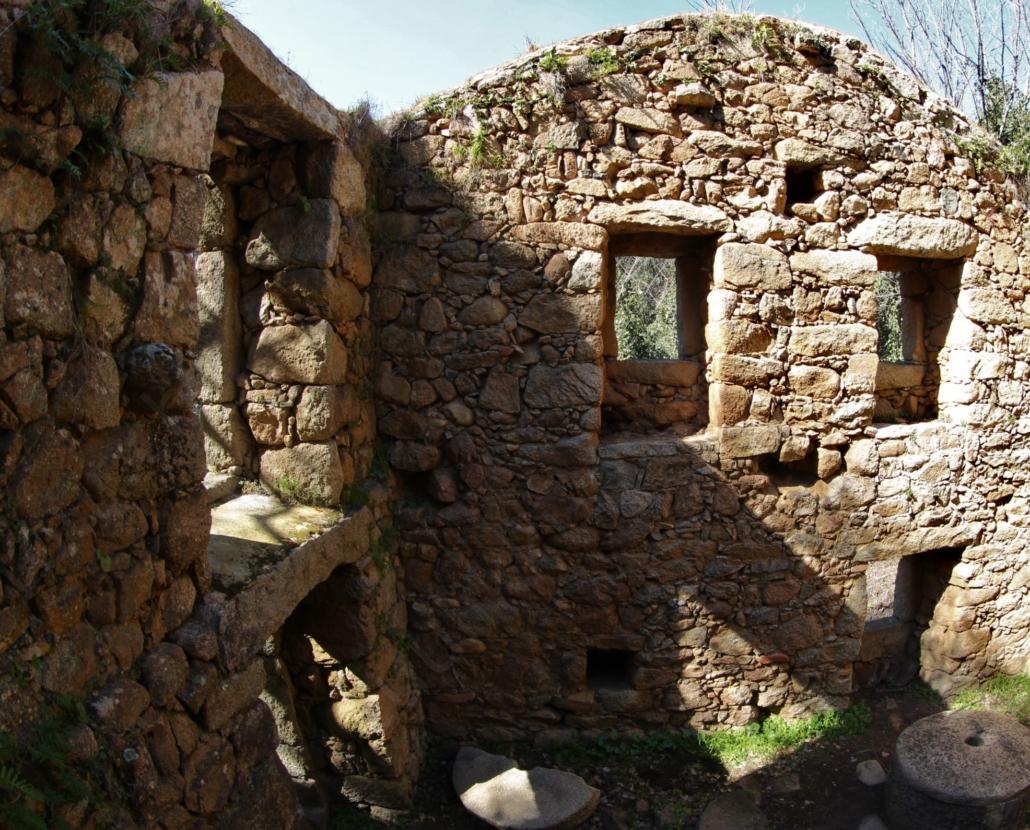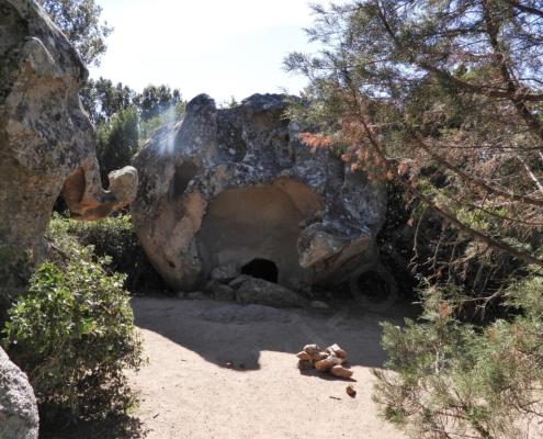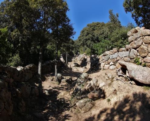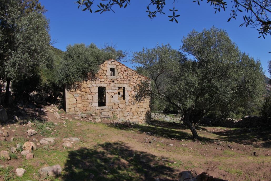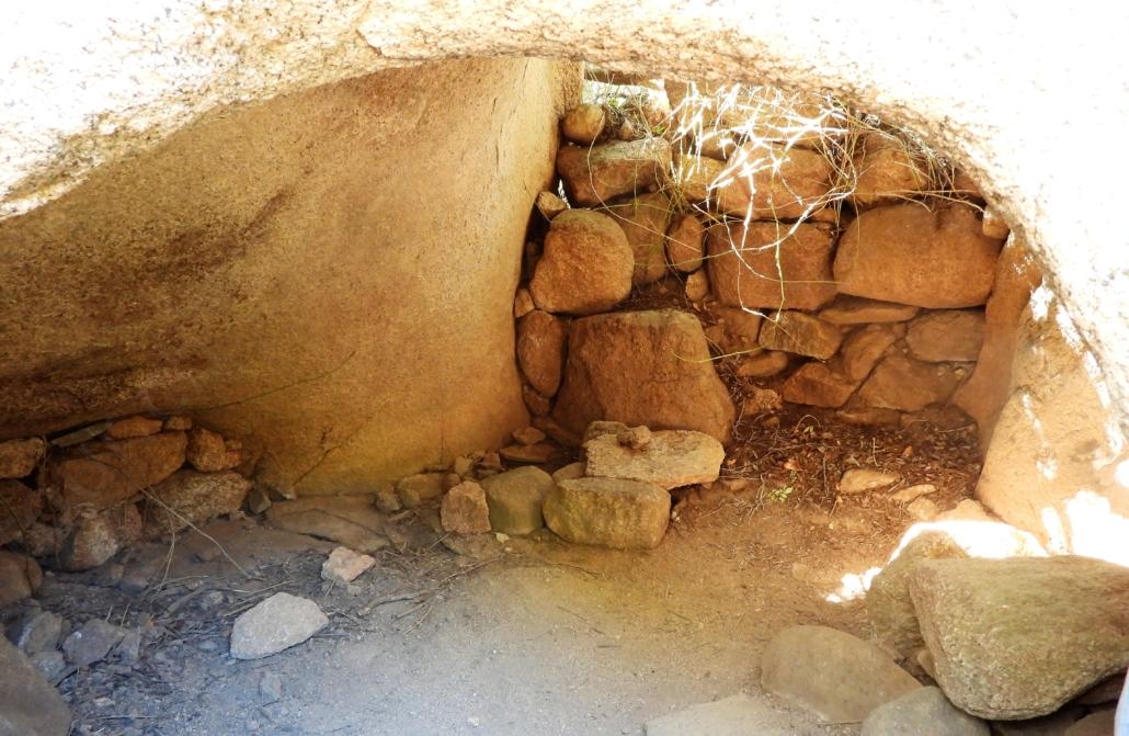 Wir sind hierher gefahren, weil uns der «Sentier du Patrimoine de Monacia-d’Aullène» von verschiedenen Seiten her empfohlen wurde. Und tatsächlich treffen wir an einem wolkenlosen, warmen Wochentag einen von Naturstein-Mauern eingefassten, schönen, abwechslungsreichen und informativen Rundweg. Zuerst geht es an den Bach runter, kurz diesem entlang – ideal für unsere Vierbeiner um nochmals ‘Markierungsflüssigkeit’ aufzunehmen – und dann über eine Holzbrücke. Ab hier geht es leicht bergauf, vorbei an knorrigen Baumstämmen und Felsen mit faszinierenden Formen und Farben. Oben angekommen treffen wir auf ein malerisches Oriu. Die aus ‘tafoni’ (Grotten) gebauten Unterstände dienten je nach Epoche als Wohnung, Grab oder Kornsilo. Dieses Oriu ist in gutem Zustand und bewerkenswert einladend sowie mit schöner Aussicht ins Tal.