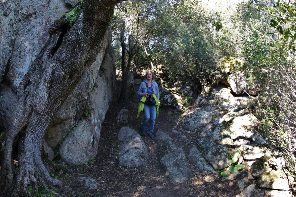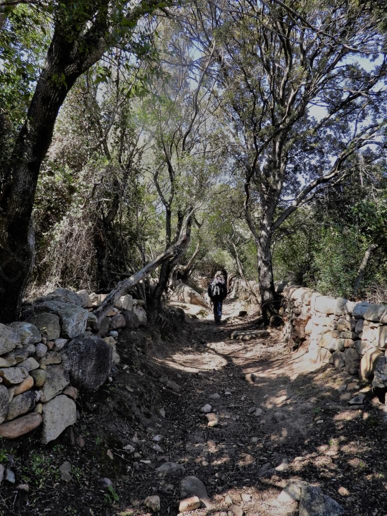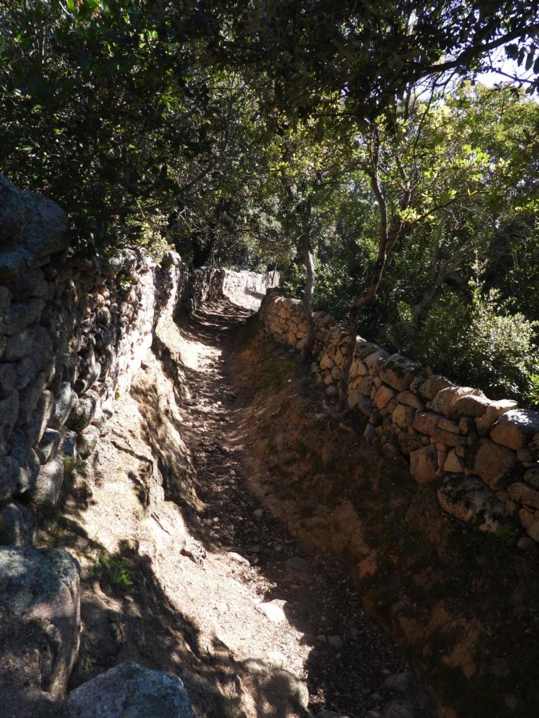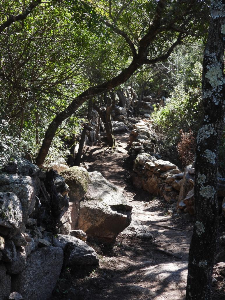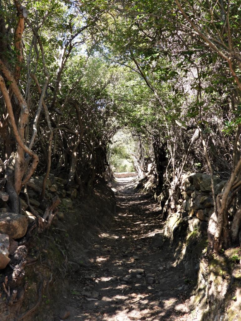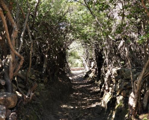 Fast auf dem gesamten Weg sind links und rechts die in mühsamer Handarbeit zu Begrenzungsmauern aufgeschichteten Steinbrocken zu sehen, dazwischen, manchmal ‚dreingeflochten‘ hin und wieder daraus hervorwachsend viele Bäume, die ab und zu eine Gasse bilden, so dass wir Schweizer uns fühlen wie bei Gessler und Wilhelm Tell „durch diese hohle Gasse muss er kommen„. 🙂