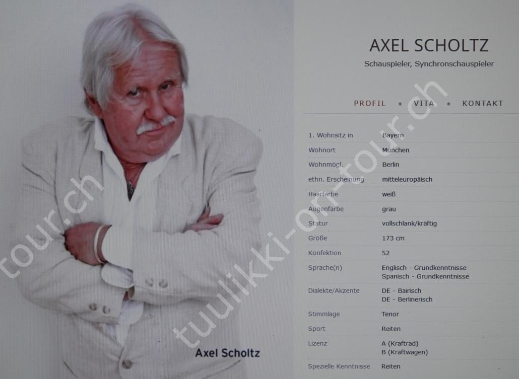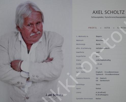 Sein Herz hing an seinem Wohnmobil, einem Ducato mit Lenkradschaltung, ausgestattet mit grosszügigen Hundebetten und allem was er sich wünschte und brauchte. Damit war er immer wieder bis ins hohe Alter allein mit seinen Hunden in Europa unterwegs und führte ein unabhängiges, abenteuerliches Leben. Seiner starken Persönlichkeit geschuldet, verzichtete er jeweils auf ein Navigationsgerät und fuhr oft einfach seiner Intuition folgend weg. Seine Hündin Bonni war sein ganzes Lebensglück. Bei einem Aufenthalt in Indien traf er auf die Strassenhündin – es muss eine augenblickliche tiefe Verbundenheit entstanden sein -. Nach seiner Rückkehr nach Deutschland machte er sich grosse Selbstvorwürfe. Axel wäre nicht Axel gewesen, hätte er nicht alle Hebel in Bewegung gesetzt, um seine Bonni wiederzufinden. Er flog also nochmals nach Indien, fand dieses Geschöpf, brachte es nach Deutschland und ab diesem Moment waren sie absolut unzertrennlich. Bonni, die uns sehr gut kannte, kam mit uns jeweils 20-30 m mit, drehte dann um und kam erst wieder mit Axel zusammen. Das Schicksal führte ihn zu der kleinen Pekinesin Chiara – das vergessene Geschöpf mit einem zugenähten Auge war für Axel die zweite grosse Liebe. Mit diesem 3-er Gespann etwas zu unternehmen war immer eine grosse Freude und ein ausserordentliches Privileg. Axel war geprägt von seiner Kindheit in der Nachkriegszeit, in der er schon als Kind gefordert war, seine Mutter zu unterstützen. Auch dies hat ihn zu einem grandiosen, wortgewaltigen Menschen gemacht, der gerne über viele Themen diskutierte, nur beim Tierschutz gabs keine Diskussion, das war verpflichtend. Mit Axel haben wir einen unerschrockenen Lebenkünstler und grandiosen Querdenker sowie einen fantastischen Schauspieler und lieben Freund verloren. Wir verwalten noch grosse Teile seines filmischen Nachlasses mit unzähligen Auftritten, Anekdoten. Axel ist am 21.4.2025 in München verstorben; Axel, wir vermissen Dich und Deine Hunde.