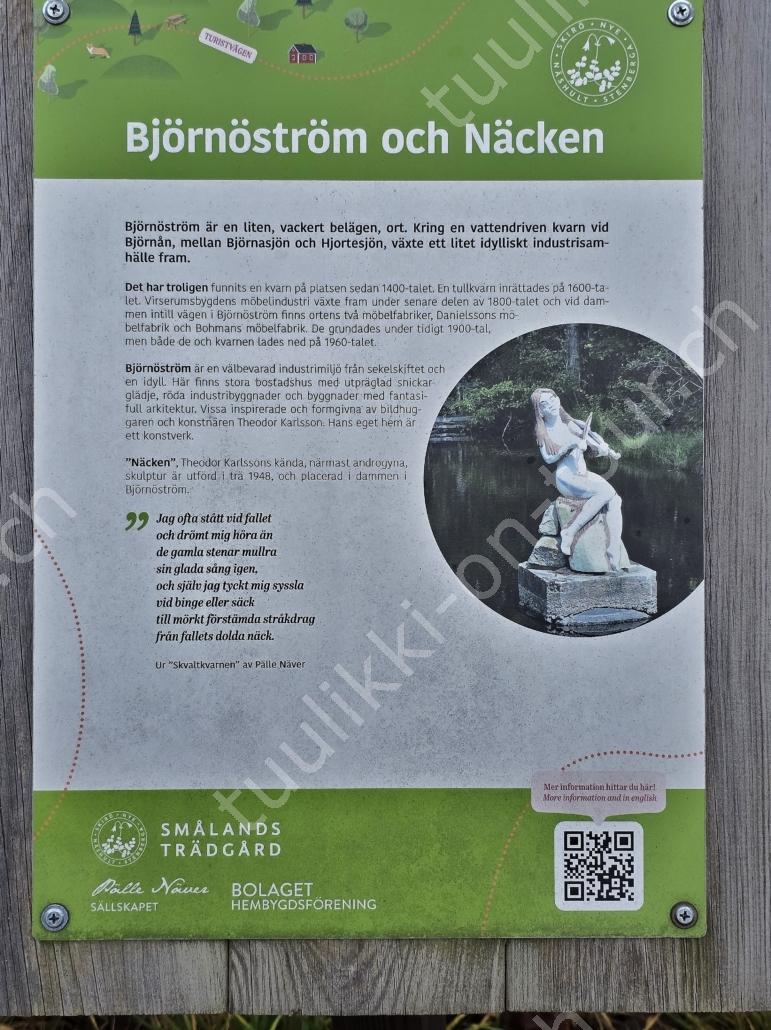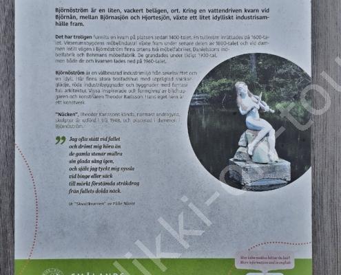 Durch eine schöne, offene Gegend erreicht man den Ort Näcken i Björneström wo die Möbelindustrie im 19. Jh ihren Aufschwung erlebte. Grosse Wohnhäuser mit aufwendigen Holzarbeiten zeugen noch heute davon. Am kleinen Stausee sind Teile der alten Mühle erhalten geblieben. Hier fühlt man sich sofort nach Kanada versetzt, einfach um ein Vielfaches kleiner.