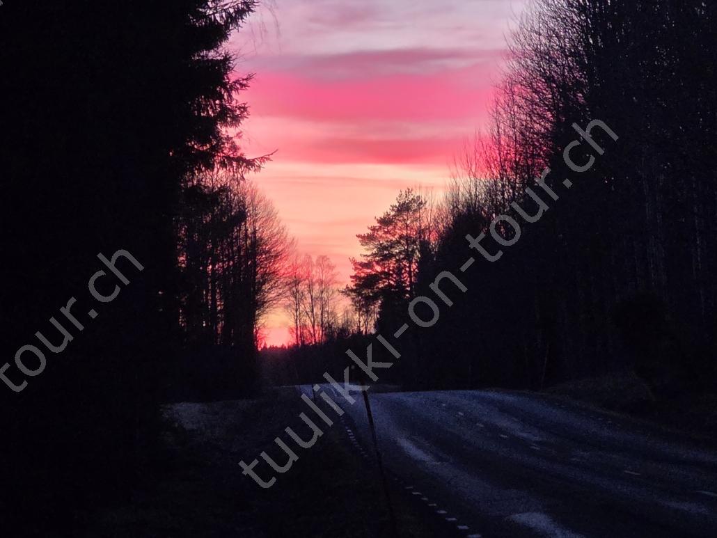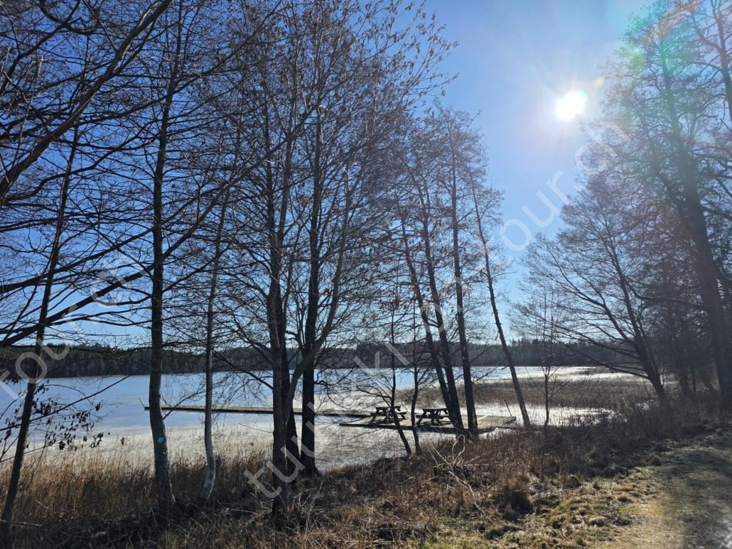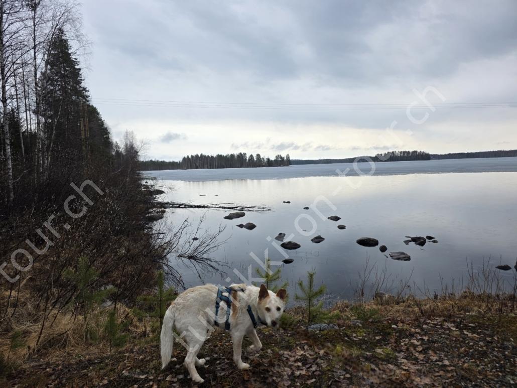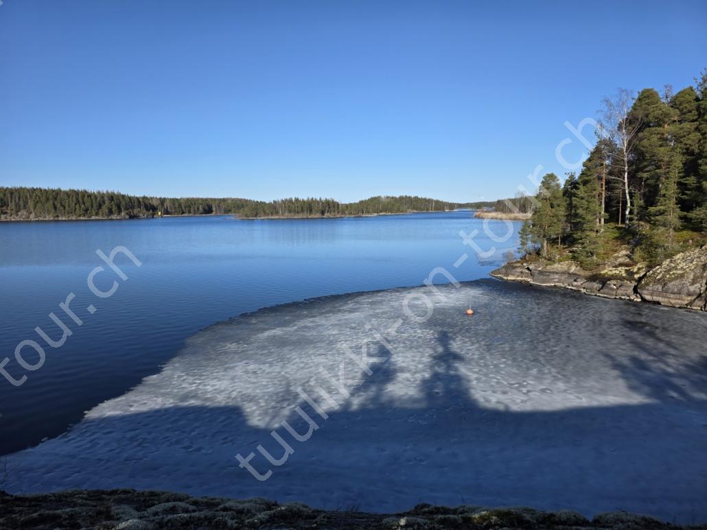 Auf der Fahrt nordwärts überlegen wir uns, gleich via Finnland weiterzufahren, buchen vorerst mal die Fähre Rostock-Trelleborg und fahren den 110’000. km des MAN. In Deutschland zahlen wir bereits € 2.259 aber was soll’s, keinen Unfall wie die, an denen wir vorbeifahren zu haben, ist wichtiger. Sturmmöven begrüssen uns in Rostock bei 6°C und die Nachtfähre bringt uns pünktlich um 05:30 Uhr in Trelleborg an. Nur 15 Min. später führen wir unsere Hunde bereits im Naturschutzgebiet bei Maglarp spazieren. Via Malmö-Helsingborg geht es zuerst zur Tierklinik in Värnamo, um die Echinococcus Behandlung im Hundepass bestätigen zu lassen (Fuchsbandwurm), die für die Einreise nach Finnland zwingend ist. Auf der Fahrt Richtung Stockholm sehen wir viele überfahrene Tiere (Dachse?) auf der Autobahn :-(. Wir tanken nochmals für SEK 23.54 und warten dann in Kapellskär (bei Stockholm) auf die Fähre, die uns in der Nacht auf die Inselgruppe von Aland im Bottnischen Meerbusen bringt. Aland gehört zu Finnland, ist weitgehend autonom und entmilitarisiert und hat als offizielle Sprache schwedisch. Aland besteht aus rund 6500 Inseln, von denen nur 60 ständig bewohnt sind. Speziell an dieser Überfahrt ist, dass wir gleich 2 Stunden unserer Lebenszeit einbüssen, denn einerseits ist uns Finnland 1 Std. voraus und andererseits wird in der Nacht die Zeitumstellung auf Sommerzeit gemacht! Während unseres kurzen Aufenthalts erinnern wir uns an das letzte Mal, als wir hier waren (im Juni 2019) und fahren in die Hauptstadt Mariehamn. Es ist nicht viel los, der Hafen ist noch unbelebt aber die Sonne begleitet uns bei 8°C. Skandinavien wie aus dem Bilderbuch: nahezu unwirklicher Kontrast von grünen Uferwiesen und dem azurblauen Meer. Am Abend heisst es schon wieder ‘boarding’ zur Fährfahrt durch das Schärengebiet nach Naantali auf dem finnischen Festland. ‘Morgens um 7 ist die Welt noch in Ordnung’, sagt man, also nehmen wir nach der Ankunft unsere beiden Hundemädchen an die Hand und machen uns – mit nüchternem Magen – auf zur 7 km Seeumrundung. Unser weiteres Ziel ist Ostfinnland, wo wir der russischen Grenzregion entlang, vorbei an Helsinki bis zum Saimaa-Kanal, einer 43 km langen, historisch bedeutsamen Wasserstrasse (die den Saimaa-See in Finnland mit dem Finnischen Meerbusen bei Wyborg in Russland verbindet) in Südkarelien fahren. Tankstopp für € 2.309 und 2.34 – USA-Iran Krieg sei dank. Via Lappeenrata-Karavansun fahren wir bis Ilomantsi, wo es beim Sportplatz genügend Parkplätze, eine super Loipenrunde (aber nur noch wenig Schneereste gibt, auf denen Pipa+Luna ihre Wohlfühl-Rugelis drehen..